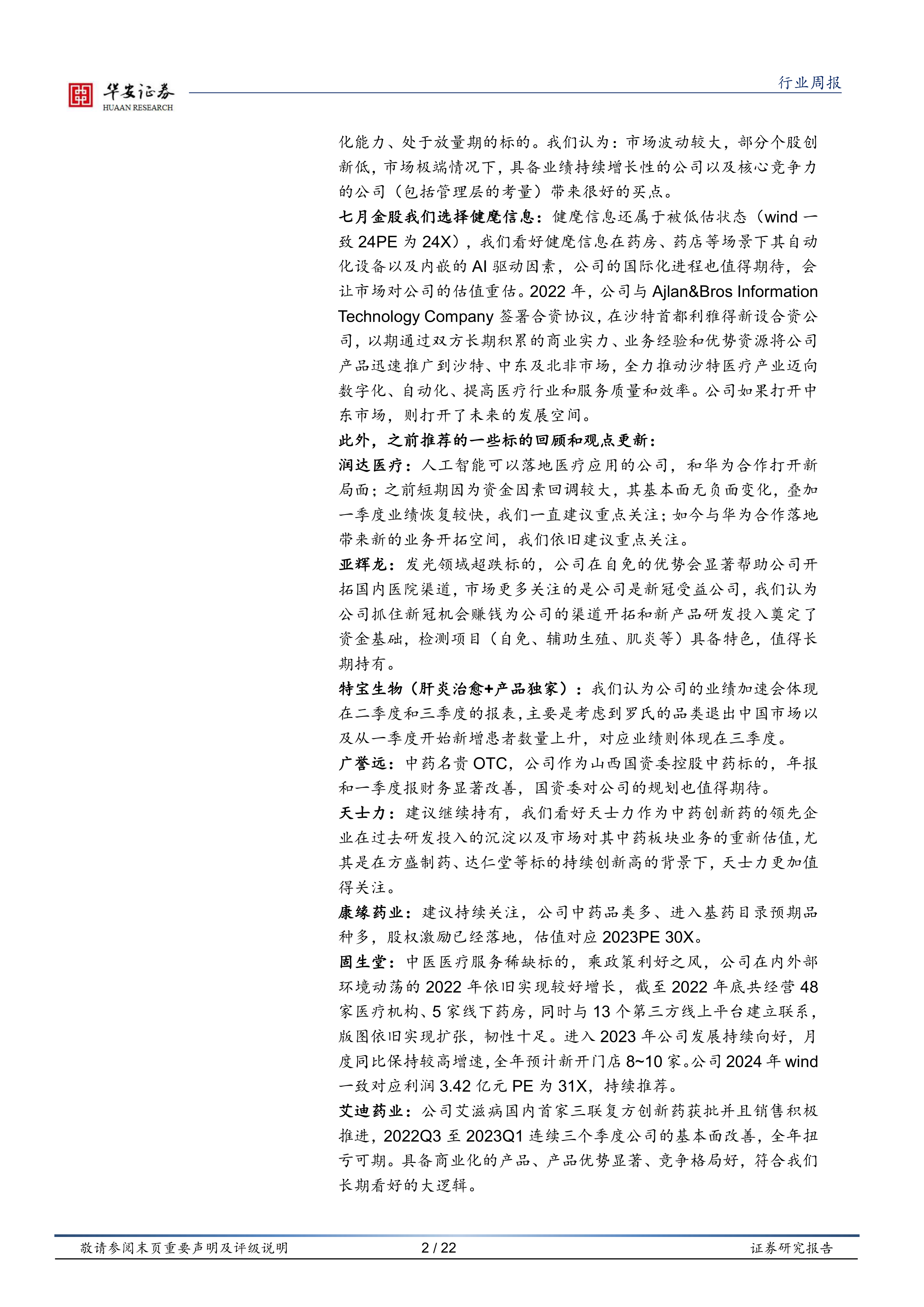 报告对多只个股进行了点评,包括健麾信息、润达医疗、亚辉龙、特宝生物、广誉远、天士力、康缘药业、固生堂和艾迪药业等。 对每只个股,报告都分析了其基本面情况、发展前景以及投资建议,并对部分个股的投资观点进行了更新。 报告最终推荐健麾信息为七月金股,并阐述了其投资逻辑,主要基于其在药房、药店等场景下的自动化设备、AI驱动因素以及国际化进程。