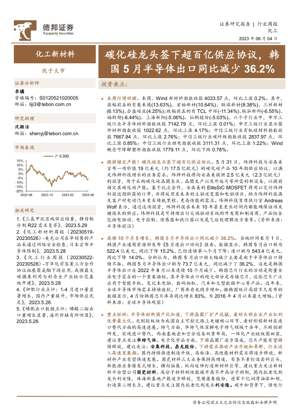 化工新材料行业周报:碳化硅龙头签下超百亿供应协议,韩国5月半导体出口同比减少36.2%