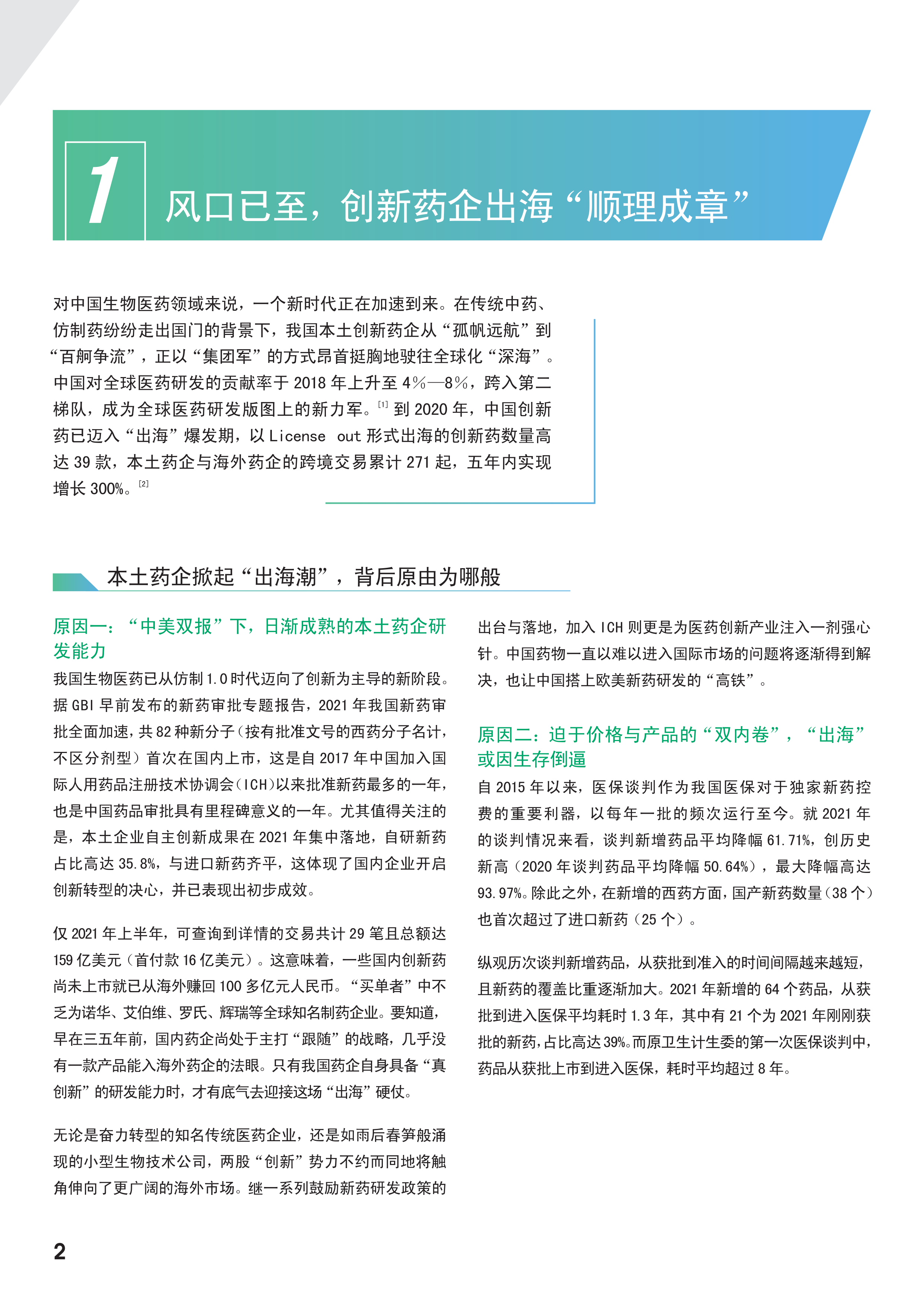 对中国生物医药领域来说,一个新时代正在加速到来。在传统中药、仿制药纷纷走出国门的背景下,我国本土创新药企从“孤帆远航”到“百舸争流”,正以“集团军”的方式昂首挺胸地驶往全球化“深海”。中国对全球医药研发的贡献率于2018年上升至4%—8%,跨入第二梯队,成为全球医药研发版图上的新力军。[1]到2020年,中国创新药已迈入“出海”爆发期,以Licenseout形式出海的创新药数量高达39款,本土药企与海外药企的跨境交易累计271起,五年内实现增长300%。