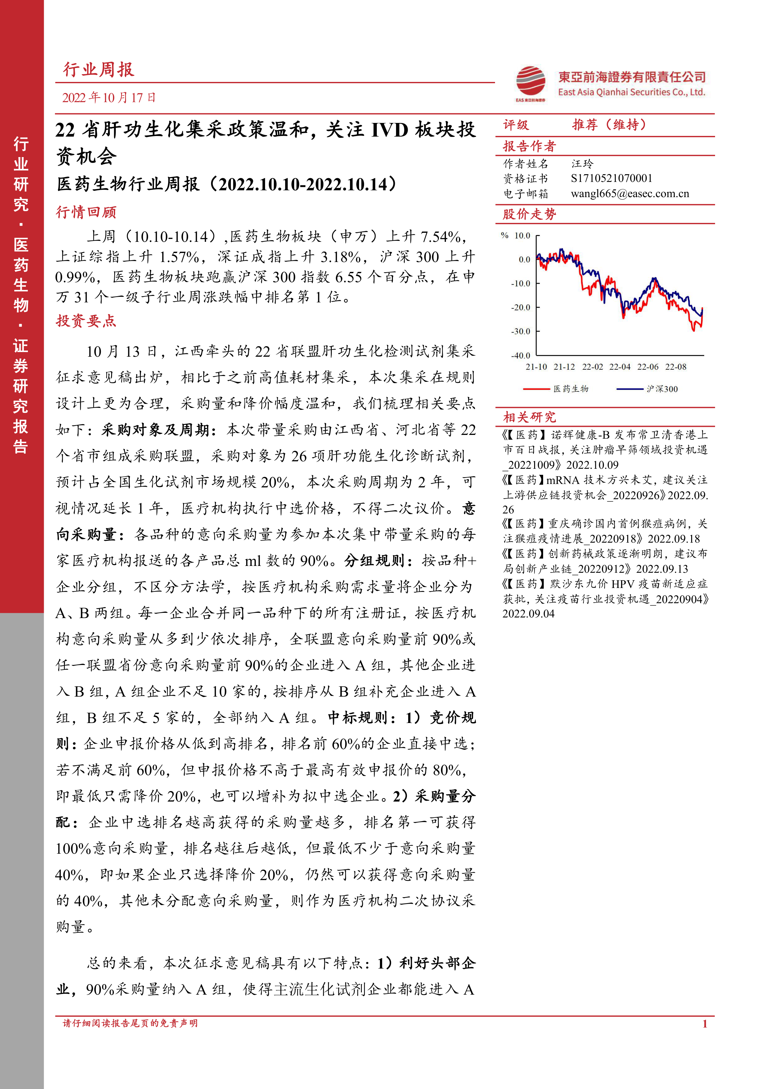 本报告对2022年10月10日至14日医药生物行业进行了周度总结,重点关注了22省肝功生化检测试剂集采政策。该政策设计相对温和,利好头部IVD企业,并对未来IVD行业集采具有示范作用。报告还对行业行情、个股表现、重要公告和行业新闻进行了梳理,并提示了政策波动风险和研发失败风险。总体而言,报告认为,22省肝功生化集采政策的出台,对行业发展具有积极意义,看好国产IVD企业的长期发展前景。