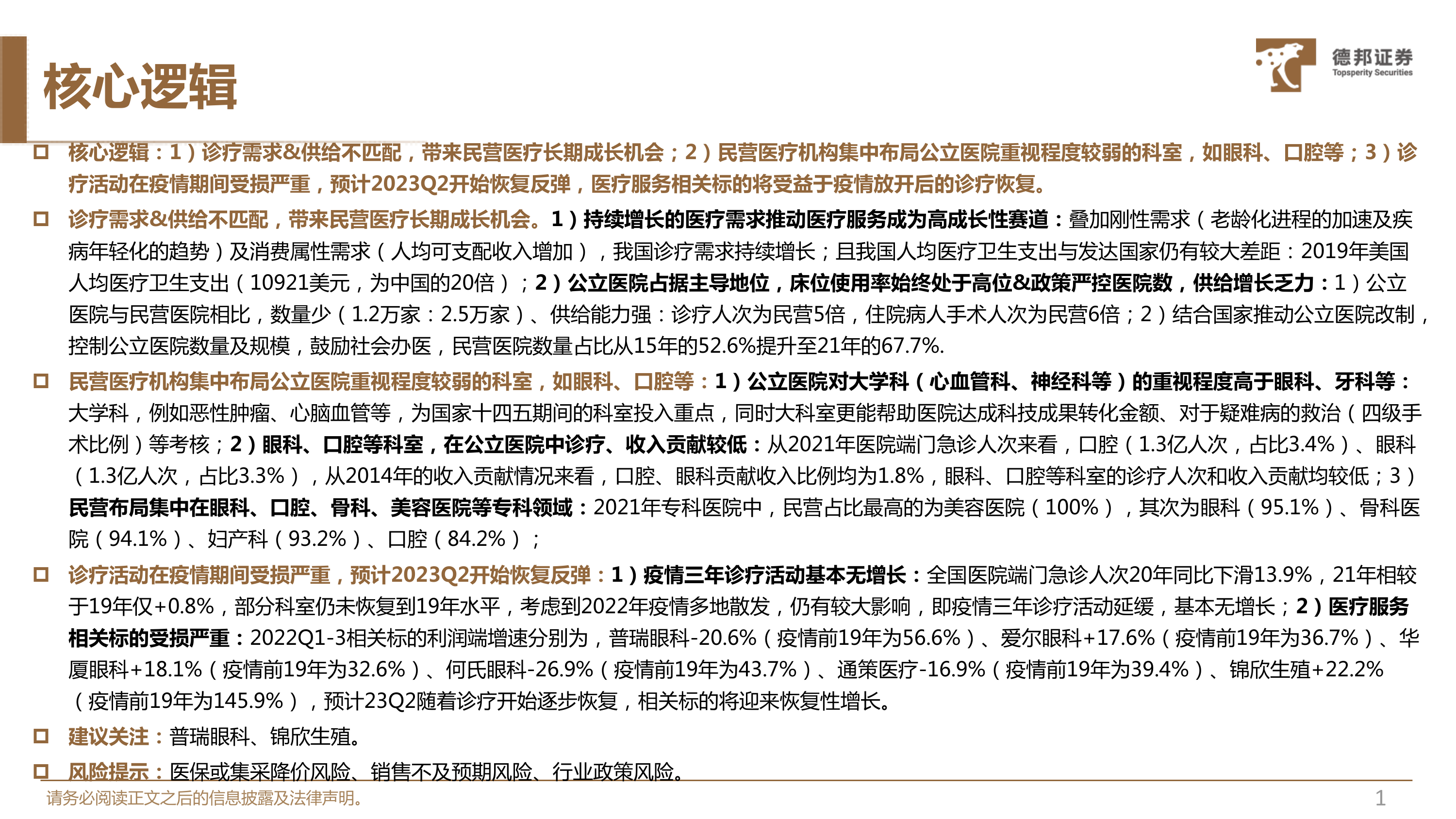 核心逻辑:1)诊疗需求&供给不匹配,带来民营医疗长期成长机会;2)民营医疗机构集中布局公立医院重视程度较弱的科室,如眼科、口腔等;3)诊疗活动在疫情期间受损严重,预计2023Q2开始恢复反弹,医疗服务相关标的将受益于疫情放开后的诊疗恢复。