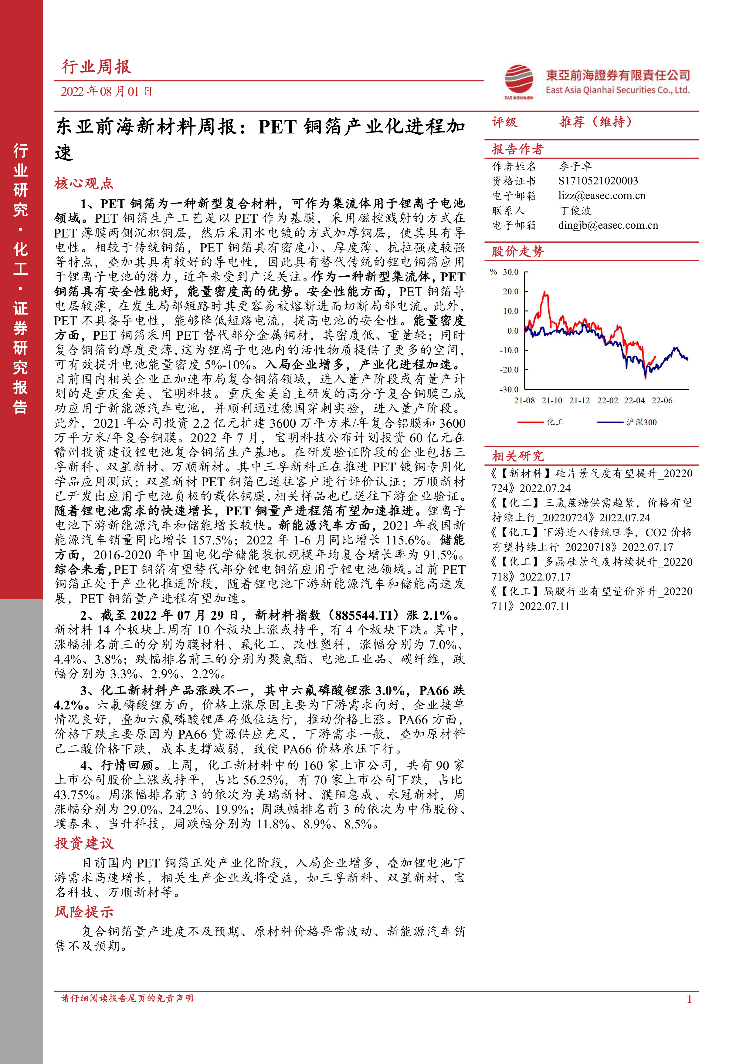 东亚前海新材料周报:PET铜箔产业化进程加速