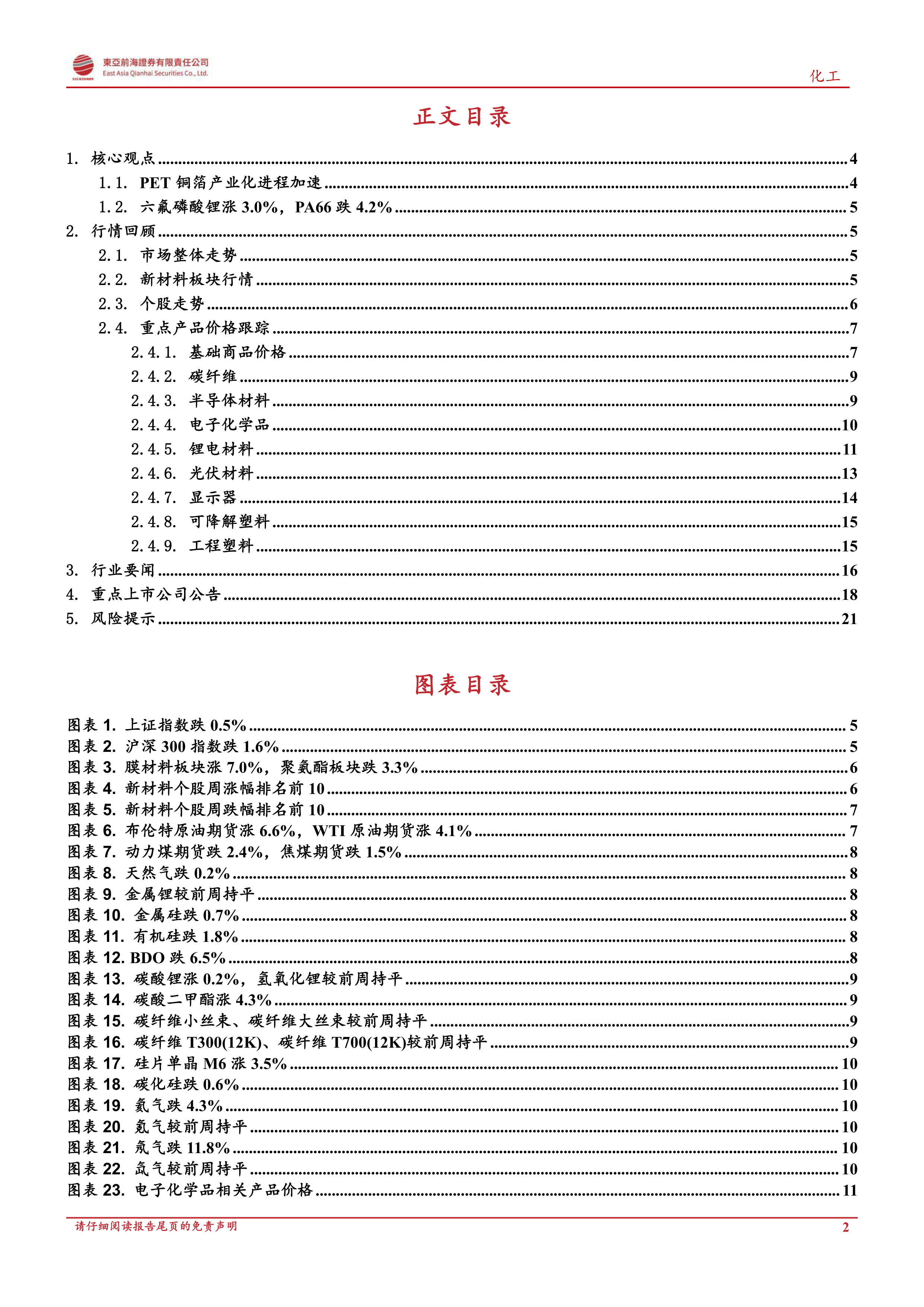 本节对化工新材料中的基础商品和重点产品价格进行了跟踪,包括能源类、金属类、化工原料类、锂电材料、光伏材料、显示器材料、可降解塑料和工程塑料等,并对价格波动的原因进行了简要分析。 数据以图表形式呈现,方便读者理解。