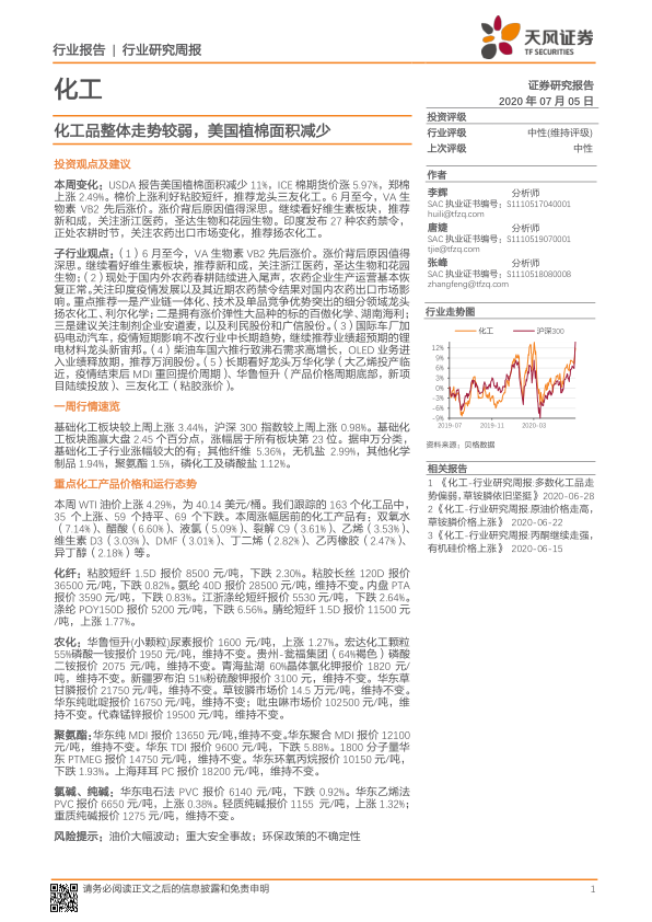 化工行业研究周报:化工品整体走势较弱,美国植棉面积减少