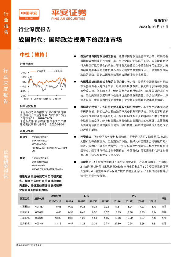 本节根据对国际原油市场走势的判断,提出了投资建议,推荐了中国石油、中国石化、恒力石化和卫星石化等股票。