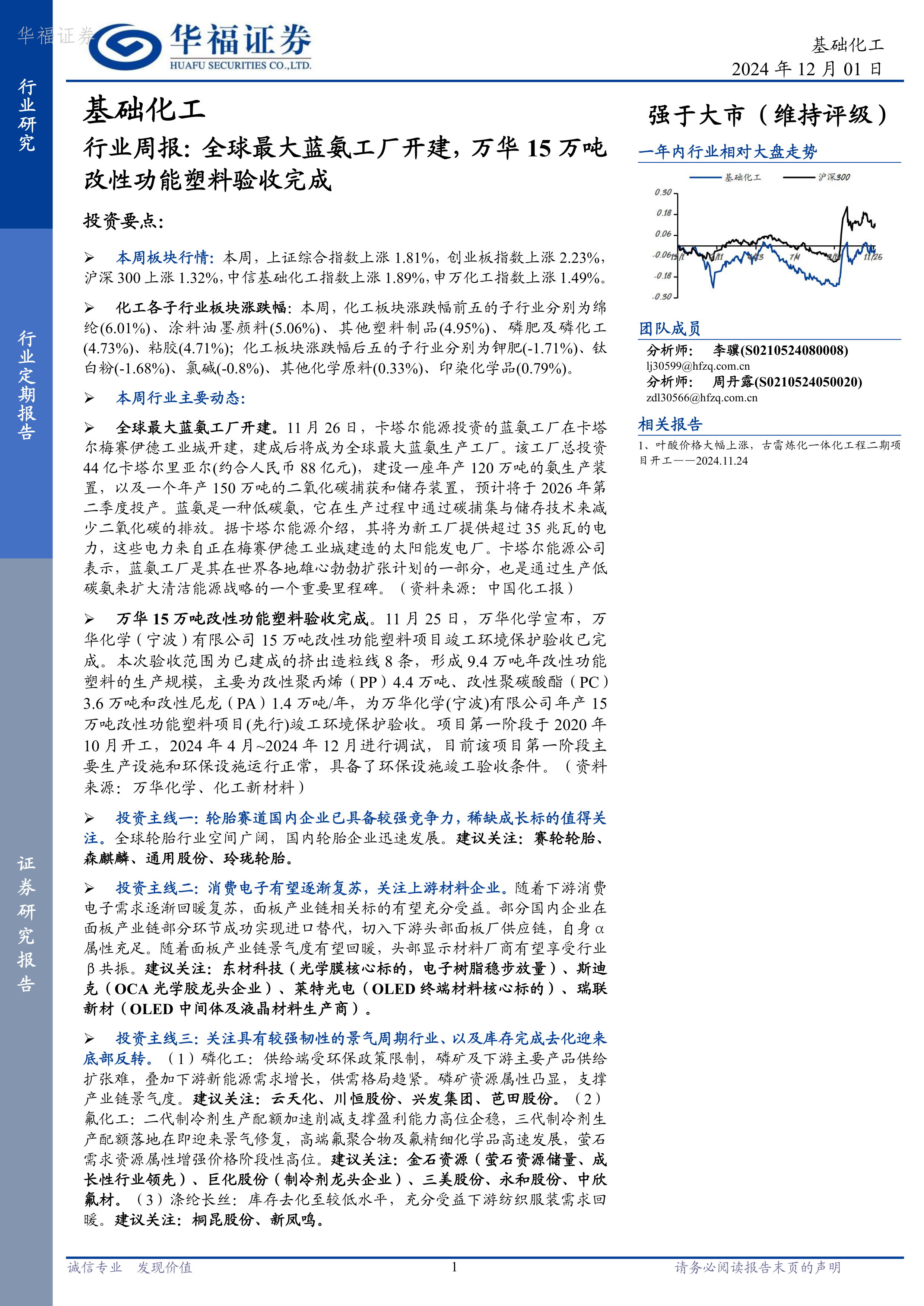 基础化工行业周报:全球最大蓝氨工厂开建,万华15万吨改性功能塑料验收完成