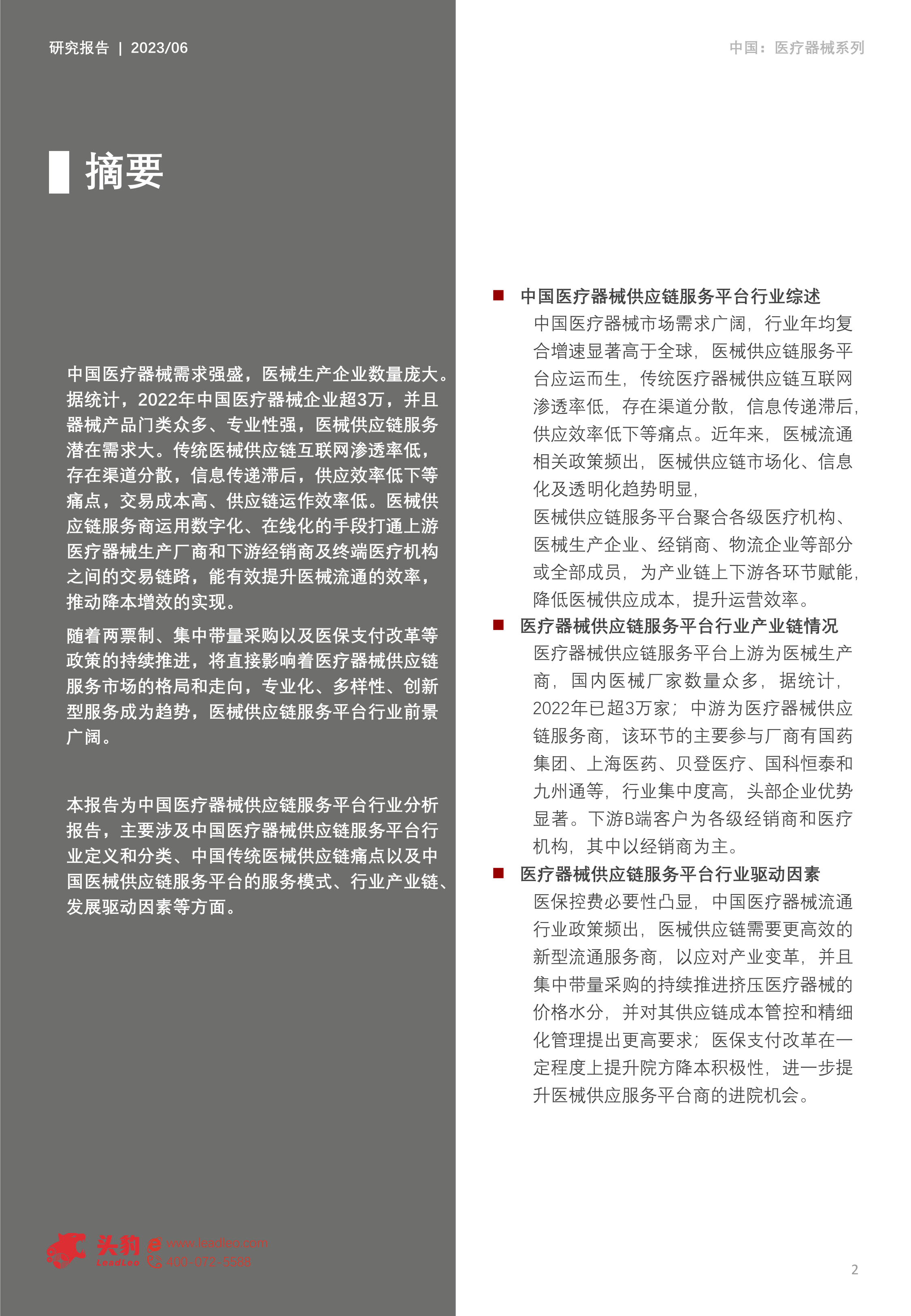 本报告的核心观点是:中国医疗器械供应链服务平台行业正处于快速发展阶段,市场规模持续扩大,年均复合增速显著高于全球平均水平。然而,传统医疗器械供应链存在诸多痛点,例如渠道分散、信息传递滞后、供应效率低下等,这为医疗器械供应链服务平台的兴起提供了巨大的市场机遇。 驱动行业发展的主要因素包括医保控费的必要性凸显、医械流通政策频出(如“两票制”)、集中带量采购对供应链成本管控提出更高要求以及医保支付改革提升院方降本积极性。 头部企业在渠道网络、供应链体系和物流资源方面拥有显著优势,但行业竞争激烈,各企业纷纷布局SPD业务以提升市场份额。 未来,数字化赋能将进一步推动行业发展,专业化、多样化、创新型服务将成为行业趋势。