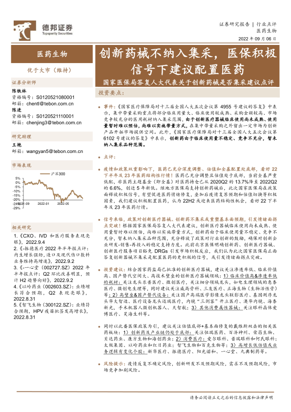 报告还列举了近期发布的几篇相关研究报告,例如对CXO、IVD和医疗服务表现的分析,对振德医疗、一心堂、以岭药业、智飞生物等公司的半年报点评等。这些报告进一步支持了报告的主要观点和投资建议。