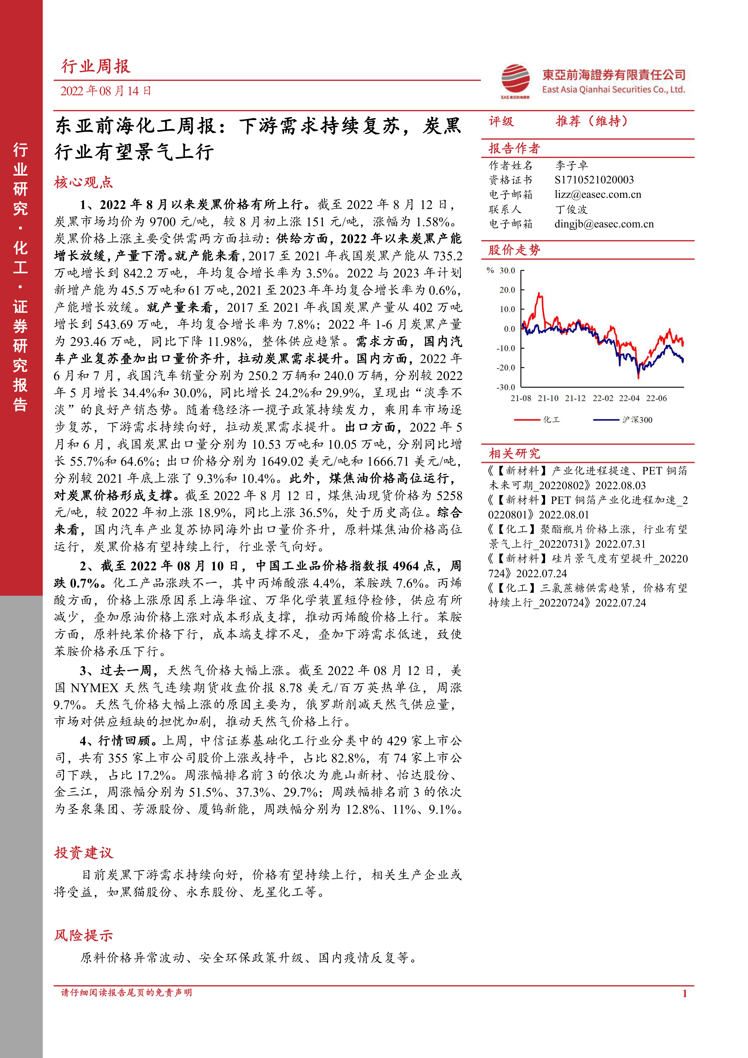 1、2022年8月以来炭黑价格有所上行。截至2022年8月12日,炭黑市场均价为9700元/吨,较8月初上涨151元/吨,涨幅为1.58%。炭黑价格上涨主要受供需两方面拉动:供给方面,2022年以来炭黑产能增长放缓,产量下滑。就产能来看,2017至2021年我国炭黑产能从735.2万吨增长到842.2万吨,年均复合增长率为3.5%。2022与2023年计划新增产能为45.5万吨和61万吨,2021至2023年年均复合增长率为0.6%,产能增长放缓。就产量来看,2017至2021年我国炭黑产量从402万吨增长到543.69万吨,年均复合增长率为7.8%;2022年1-6月炭黑产量为293.46万吨,同比下降11.98%,整体供应趋紧。需求方面,国内汽车产业复苏叠加出口量价齐升,拉动炭黑需求提升。国内方面,2022年6月和7月,我国汽车销量分别为250.2万辆和240.0万辆,分别较2022年5月增长34.4%和30.0%,同比增长24.2%和29.9%,呈现出“淡季不淡”的良好产销态势。随着稳经济一揽子政策持续发力,乘用车市场逐步复苏,下游需求持续向好,拉动炭黑需求提升。出口方面,2022年5月和6月,我国炭黑出口量分别为10.53万吨和10.05万吨,分别同比增长55.7%和64.6%;出口价格分别为1649.02美元/吨和1666.71美元/吨,分别较2021年底上涨了9.3%和10.4%。此外,煤焦油价格高位运行,对炭黑价格形成支撑。截至2022年8月12日,煤焦油现货价格为5258元/吨,较2022年初上涨18.9%,同比上涨36.5%,处于历史高位。综合来看,国内汽车产业复苏协同海外出口量价齐升,原料煤焦油价格高位运行,炭黑价格有望持续上行,行业景气向好。