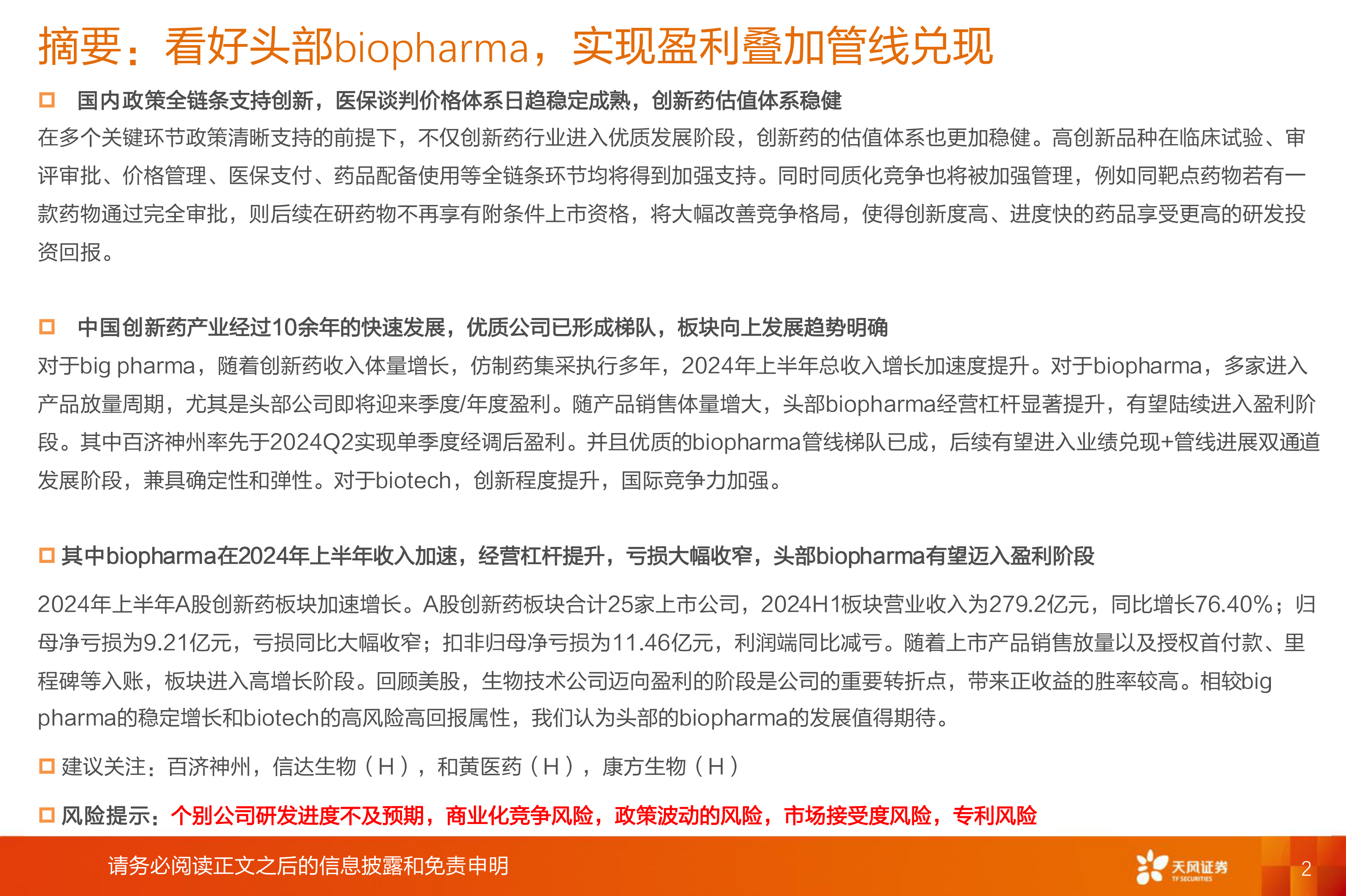 其中biopharma在2024年上半年收入加速,经营杠杆提升,亏损大幅收窄,头部biopharma有望迈入盈利阶段