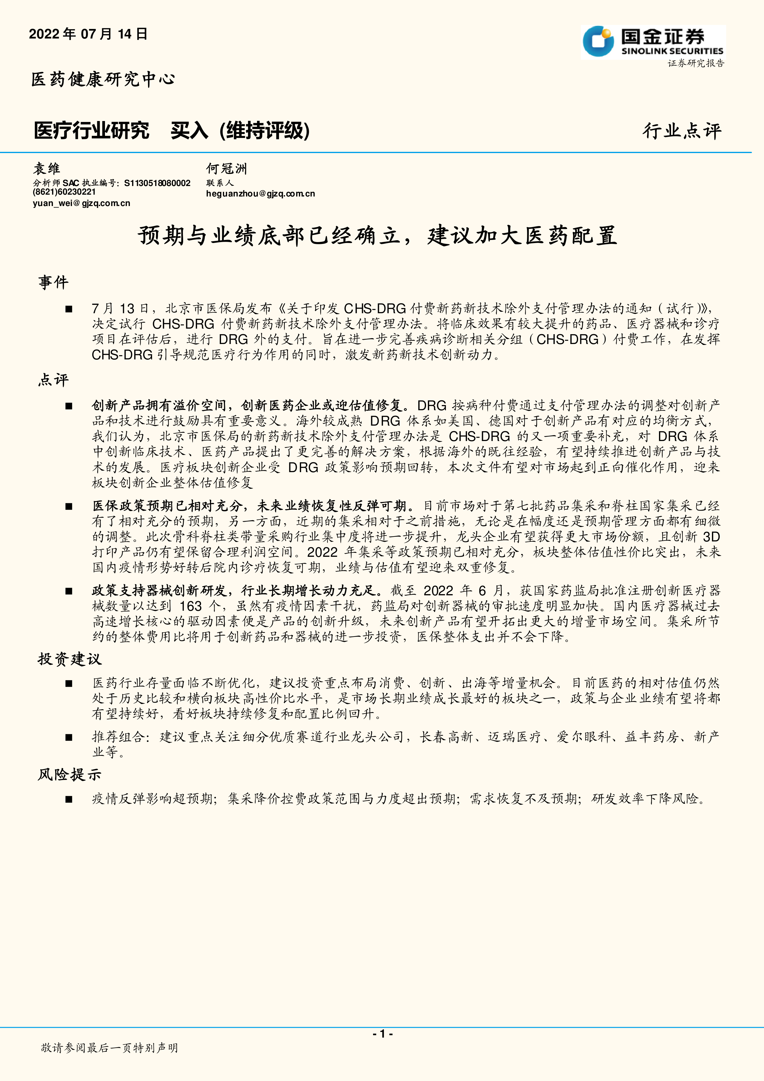 疫情反弹影响超预期;集采降价控费政策范围与力度超出预期;需求恢复不及预期;研发效率下降风险。