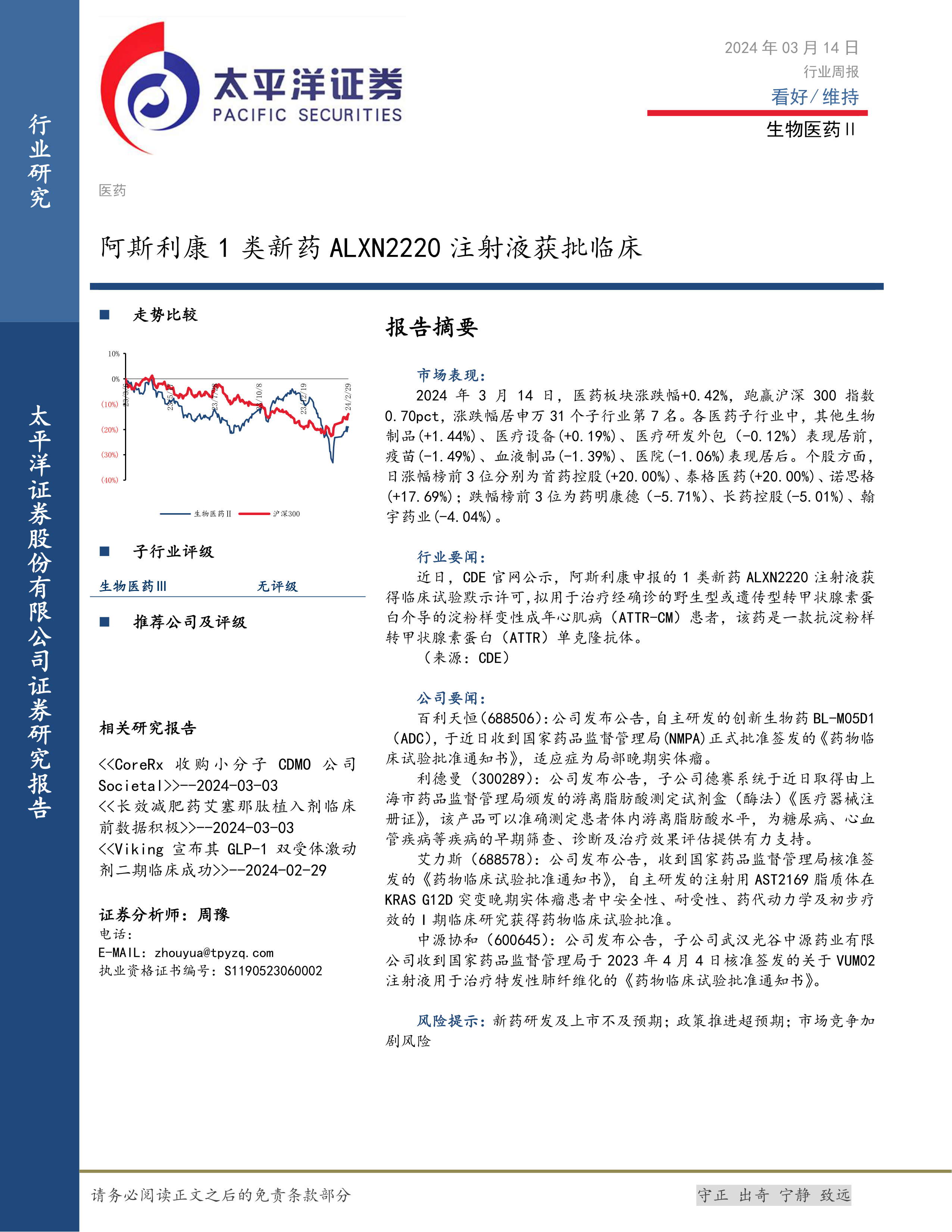 本报告的核心观点是:生物医药行业近期表现分化,部分细分领域表现强劲,部分领域表现疲软。阿斯利康1类新药ALXN2220注射液获批临床试验,为ATTR-CM治疗带来新的希望,也体现了行业创新活力。然而,市场整体波动较大,个股涨跌幅度显著,投资者需谨慎对待。