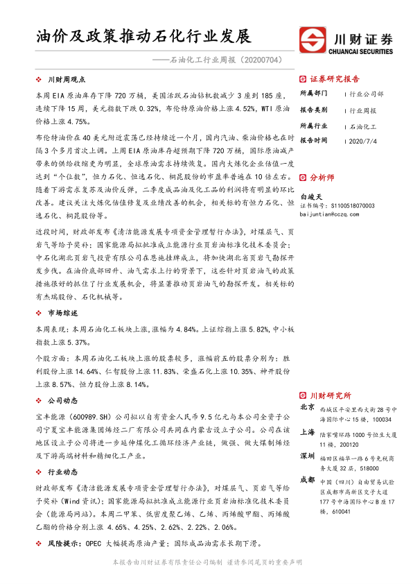 本报告分析了2020年7月4日一周石油化工行业的市场行情和重要动态。国际原油价格上涨和中国政府对页岩油气产业的政策支持是本周行业发展的主要驱动力。原油价格上涨直接利好大炼化企业,改善其盈利能力;而页岩油气政策的出台则为该细分领域带来了新的发展机遇。报告还对部分上市公司的公告进行了总结,并提示了OPEC限产协议执行率、美国页岩油增产、国际成品油需求以及油气改革等潜在风险。 投资者需综合考虑市场风险和政策风险,谨慎决策。