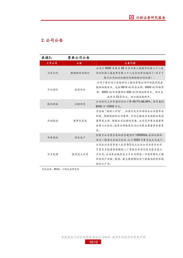 本周重要公司公告包括:卫星石化船舶租约及转让、中化国际投资项目、联化科技业绩预告、杰瑞股份董事长变更、华峰氨纶项目达产、宝丰能源投资设立公司等。
