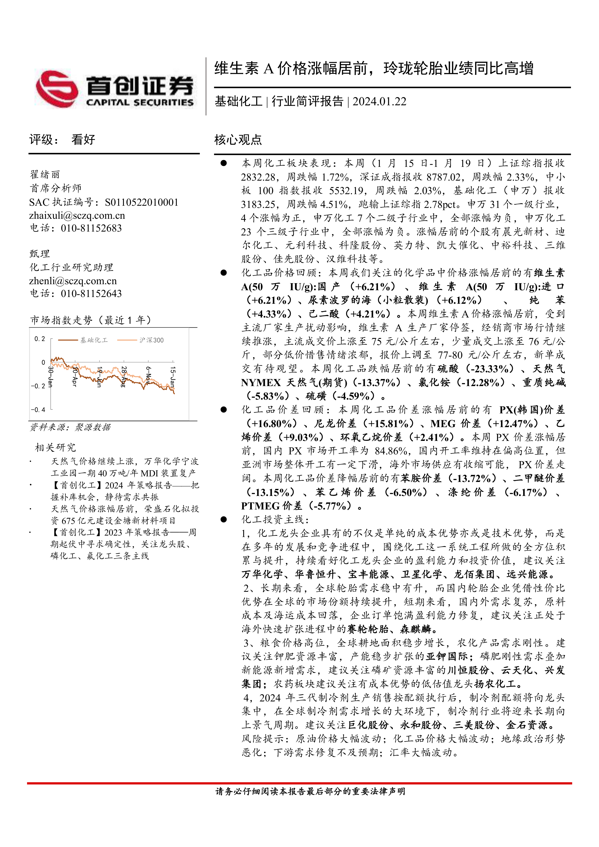 本报告基于首创证券对本周化工行业市场表现的跟踪和分析,利用统计数据和图表,对化工行业整体表现、化工品价格及价差波动、主要上市公司公告以及重点行业的价格和价差走势进行了全面分析。报告指出,本周基础化工行业整体表现疲软,但维生素A等部分化工品价格逆势上涨。 报告最后提出了投资建议,建议关注化工龙头企业、轮胎企业和农化企业,并提示了投资化工行业的潜在风险。 投资者应结合自身情况,谨慎决策。