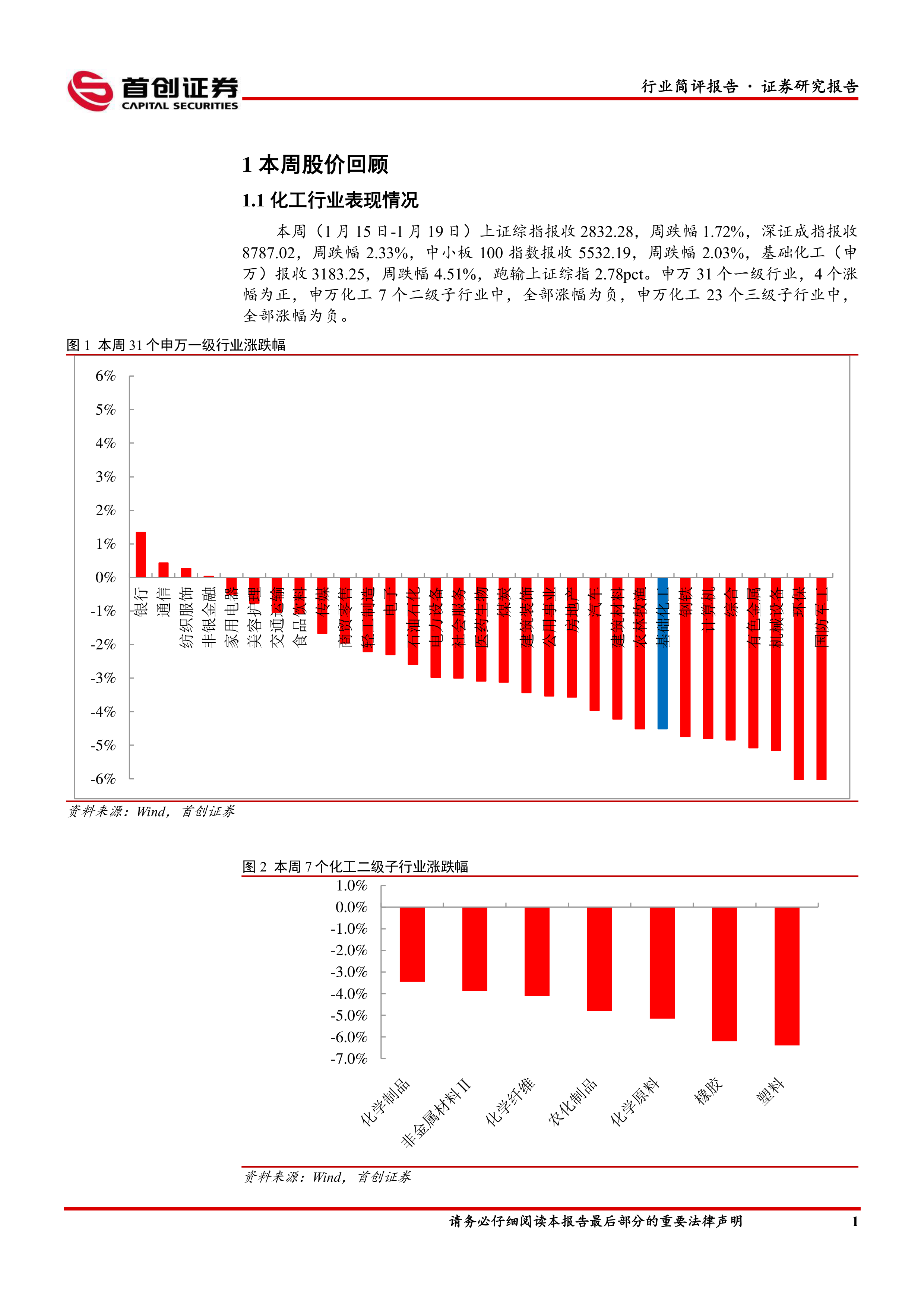 本周化工板块表现:本周(1月15日-1月19日)上证综指报收2832.28,周跌幅1.72%,深证成指报收8787.02,周跌幅2.33%,中小板100指数报收5532.19,周跌幅2.03%,基础化工(申万)报收3183.25,周跌幅4.51%,跑输上证综指2.78pct。申万31个一级行业,4个涨幅为正,申万化工7个二级子行业中,全部涨幅为负,申万化工23个三级子行业中,全部涨幅为负。涨幅居前的个股有晨光新材、迪尔化工、元利科技、科隆股份、英力特、凯大催化、中裕科技、三维股份、佳先股份、汉维科技等。