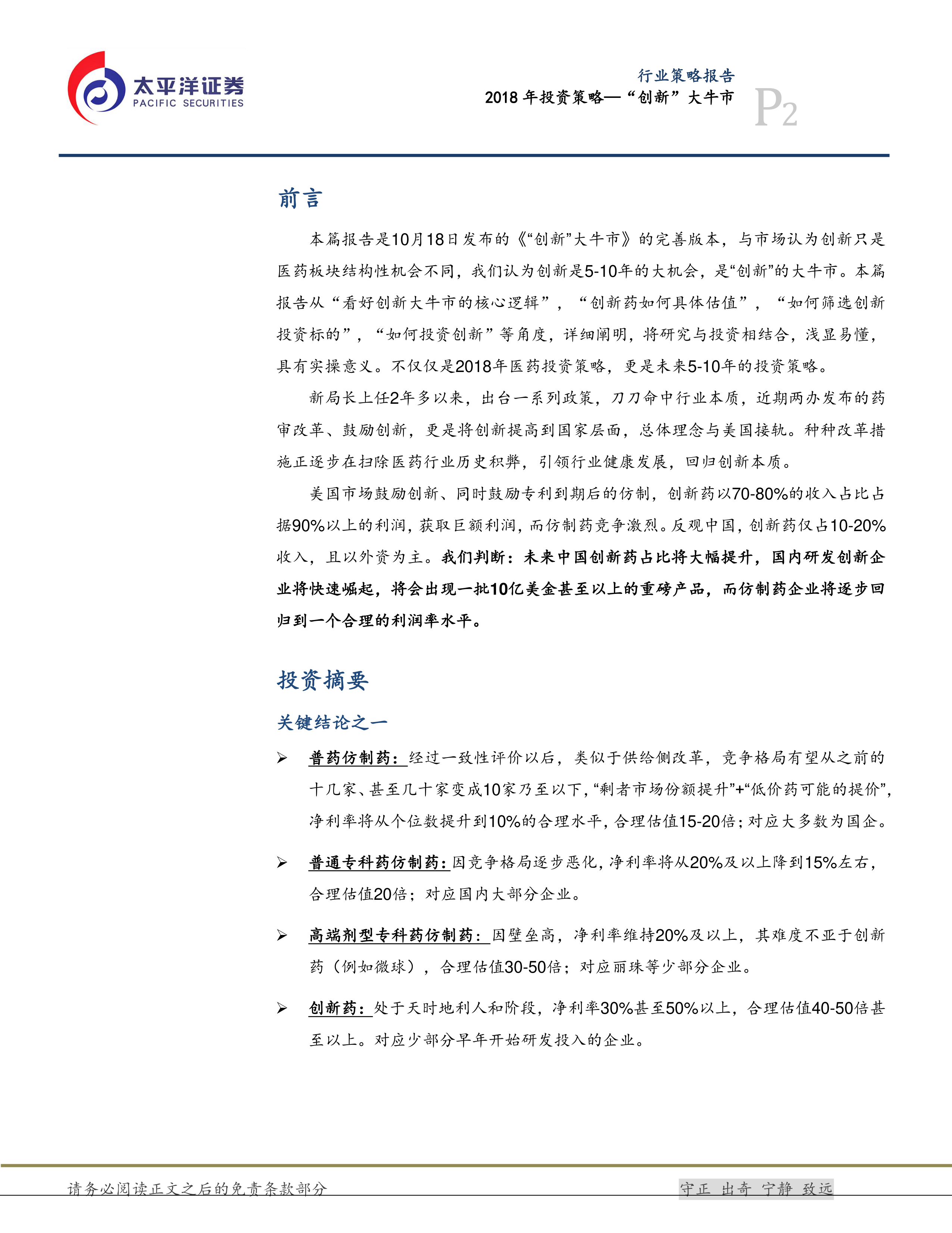 本报告的核心观点是:中国医药行业正进入“创新药”时代,这是一个5-10年的大机会,创新将引领医药行业进入新时代。 报告基于对政策鼓励、企业研发投入、全球创新趋势以及创新药估值方法的分析,看好创新药的未来发展,并推荐了一系列具有投资价值的创新型医药公司。
