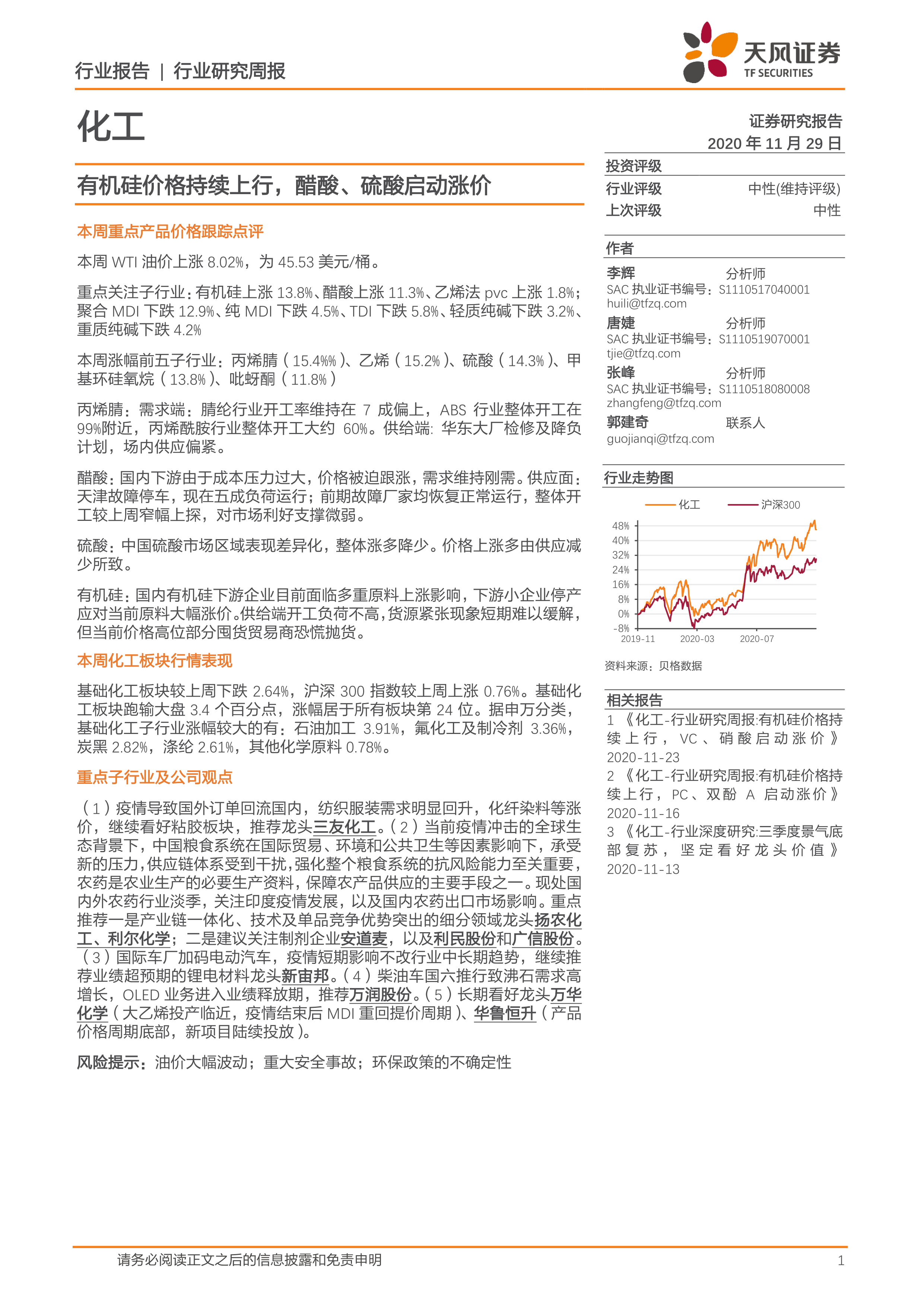 本报告的核心观点是:2020年11月29日,化工行业整体表现弱于大盘,基础化工板块下跌2.64%,跑输沪深300指数3.4个百分点。部分化工产品价格持续上涨,例如有机硅、醋酸和硫酸,涨幅分别为13.8%、11.3%和14.3%;而另一些产品价格则下跌,例如聚合MDI、纯MDI和TDI。这种价格分化主要受供需关系、成本压力以及下游行业景气度等因素影响。报告建议关注粘胶、农药、锂电材料、沸石和部分化工龙头企业。