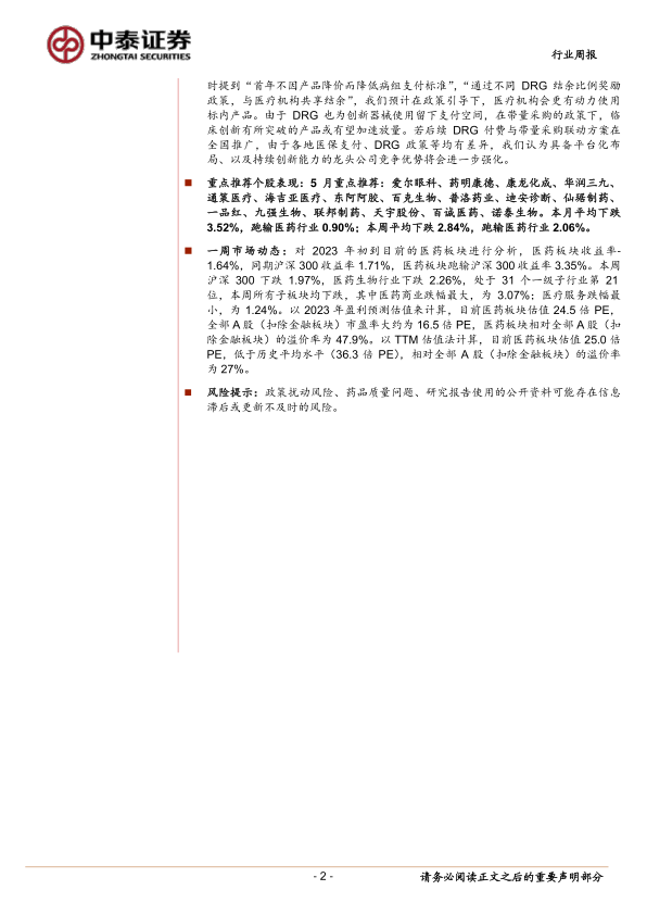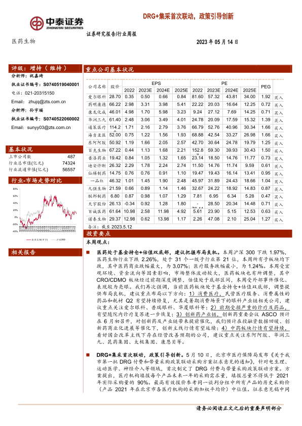 本报告的核心观点是:医药板块目前处于基金持仓和估值双底,投资机会显现;DRG+集采联动政策推动行业创新,利好具备平台化布局和持续创新能力的龙头企业;部分细分领域如消费医疗和创新药产业链值得重点关注。