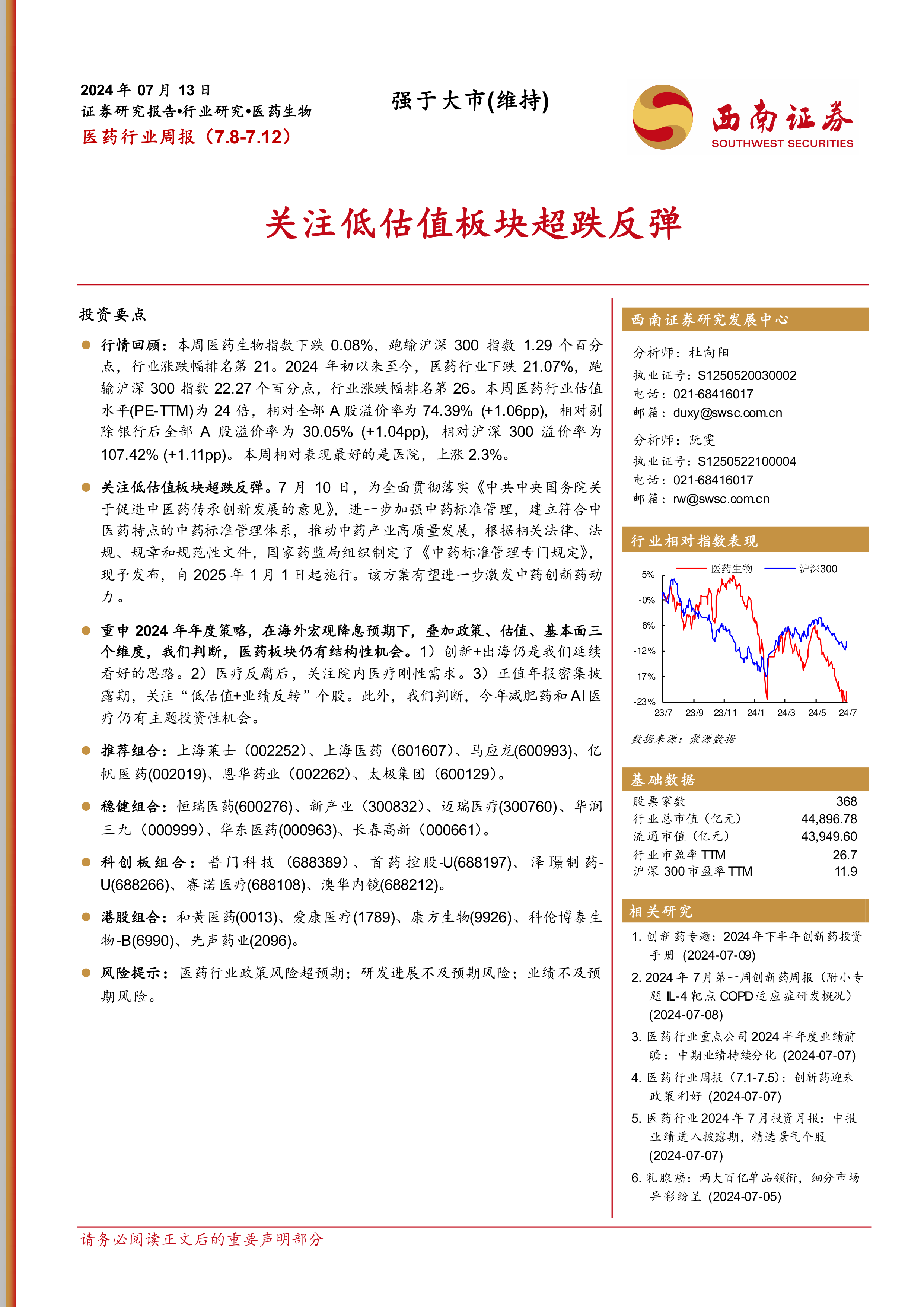 本报告对 2024年7月8日至12日一周的医药行业市场进行了全面分析,涵盖了市场表现、资金流向、公司动态以及政策解读等多个方面。尽管短期市场波动存在,但报告基于多维度分析,维持对医药板块结构性机会的积极判断,并建议投资者关注低估值板块的超跌反弹,以及“低估值+业绩反转”个股。报告提供的投资组合建议和相关数据,为投资者制定投资策略提供了参考依据。 然而,投资者仍需注意报告中提到的风险提示,并根据自身情况进行独立判断。