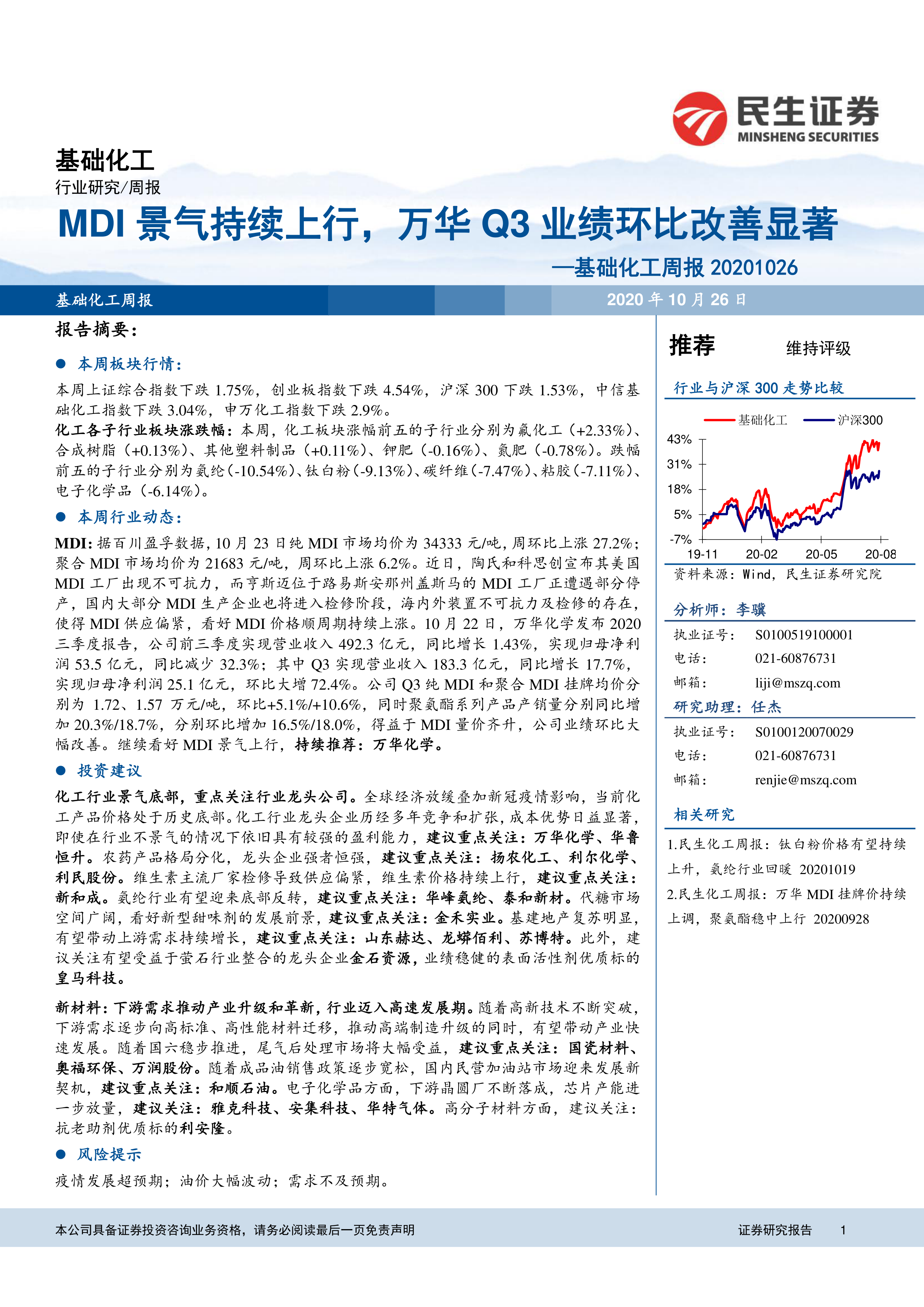 基础化工周报:MDI景气持续上行,万华Q3业绩环比改善显著