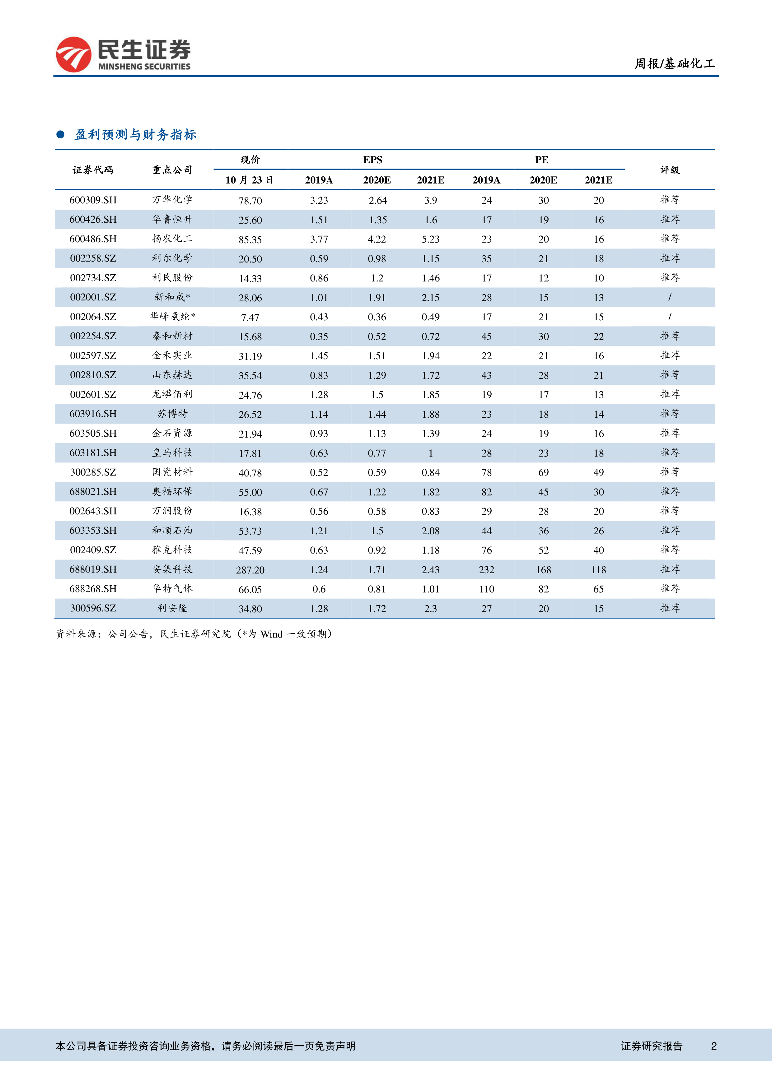 报告对万华化学、华鲁恒升等重点公司进行了盈利预测和财务指标分析,提供了这些公司的EPS、PE等关键财务数据,为投资者提供投资参考。