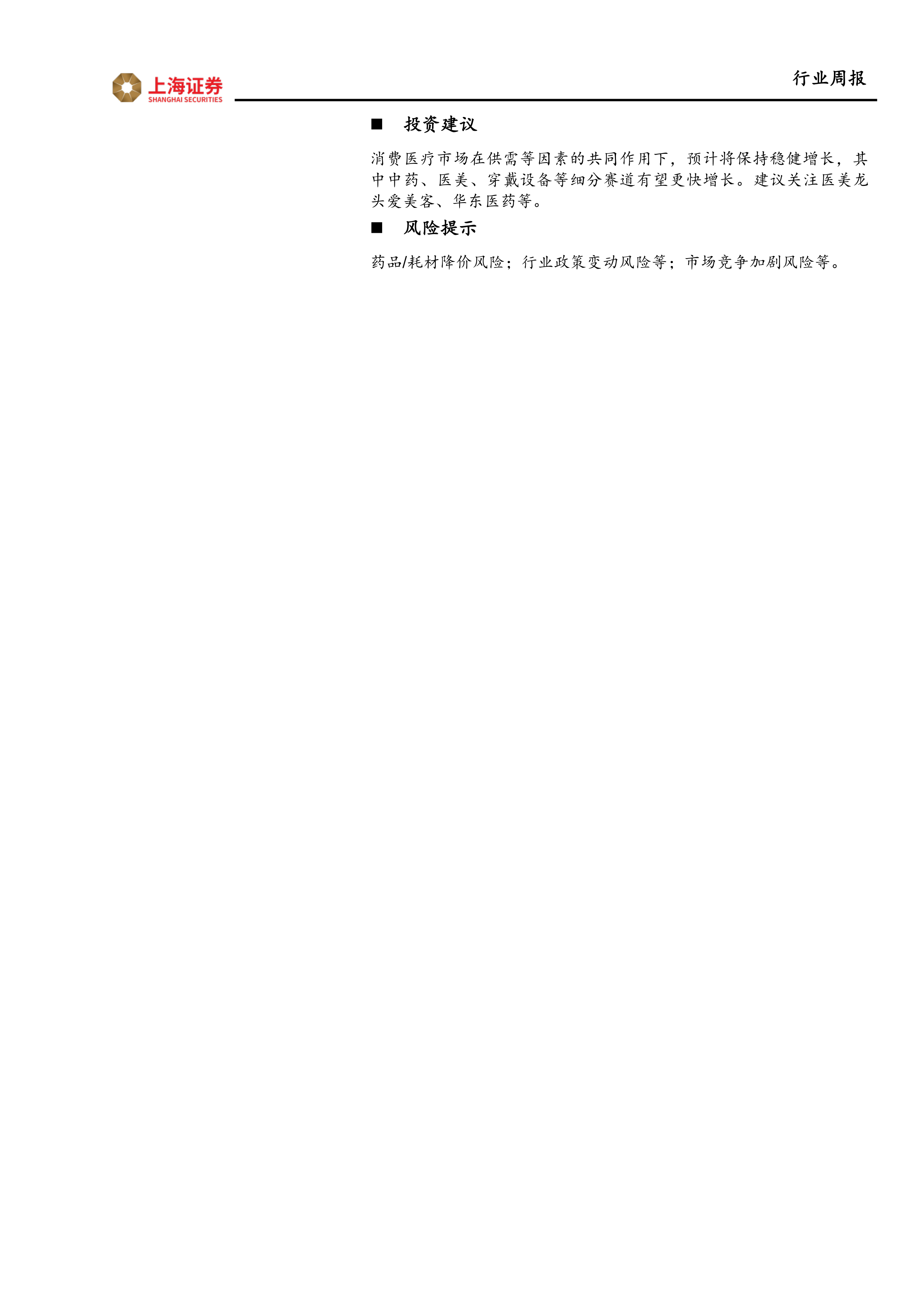 消费医疗市场在供需等因素的共同作用下,预计将保持稳健增长,其中中药、医美、穿戴设备等细分赛道有望更快增长。建议关注医美龙头爱美客、华东医药等。