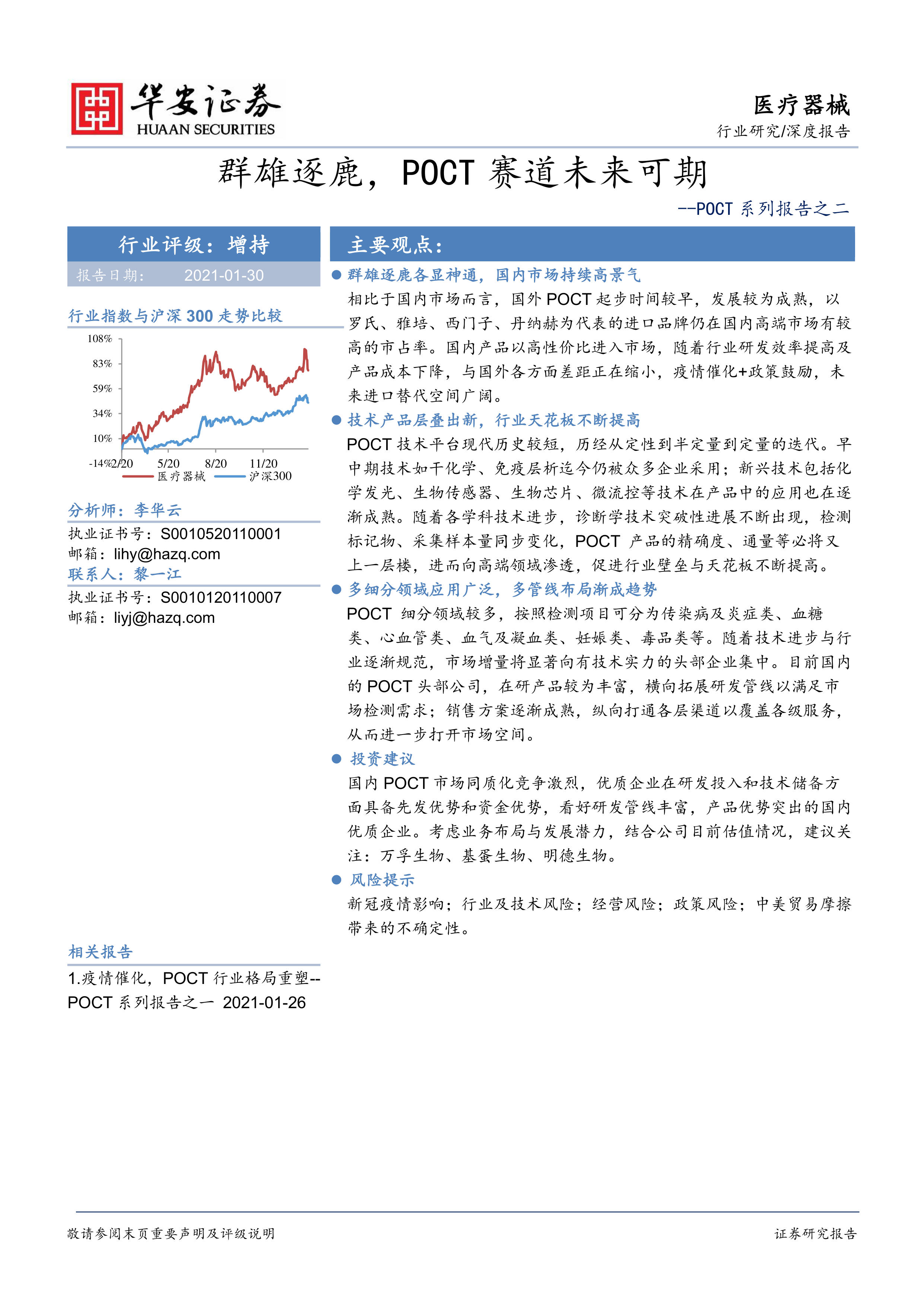 报告最后给出了投资建议,看好研发管线丰富、产品优势突出的国内优质企业,建议关注万孚生物、基蛋生物和明德生物。同时,报告也列出了潜在的风险因素,包括新冠疫情影响、行业及技术风险、经营风险、政策风险以及中美贸易摩擦带来的不确定性。