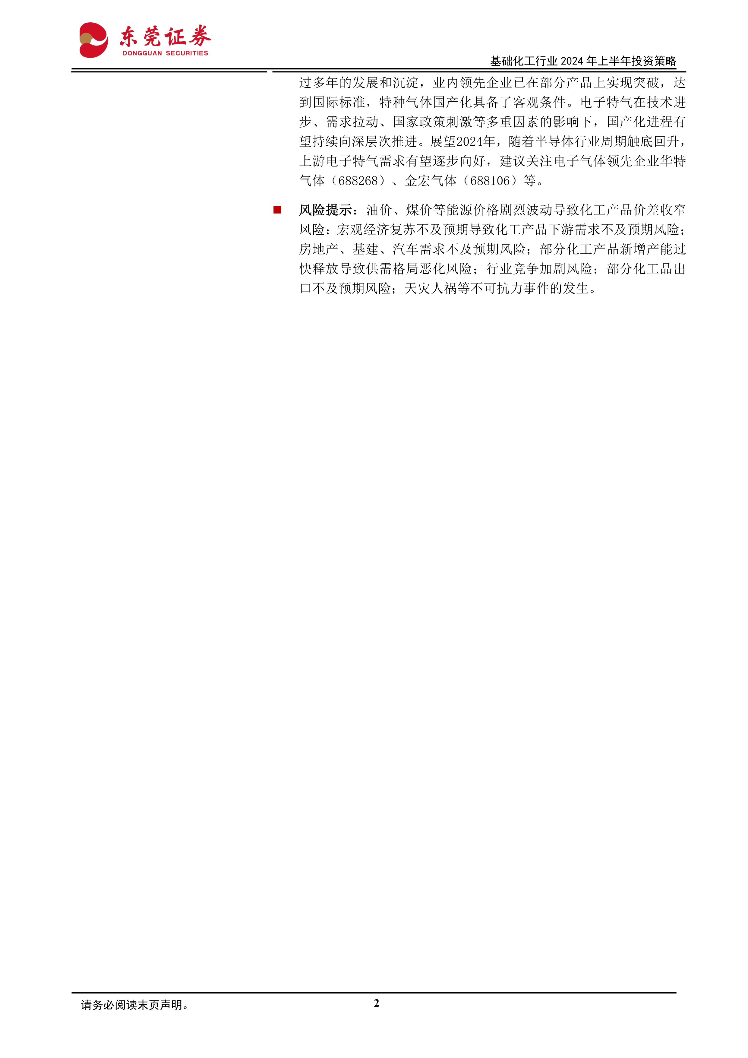 风险提示:油价、煤价等能源价格剧烈波动导致化工产品价差收窄风险;宏观经济复苏不及预期导致化工产品下游需求不及预期风险;房地产、基建、汽车需求不及预期风险;部分化工产品新增产能过快释放导致供需格局恶化风险;行业竞争加剧风险;部分化工品出口不及预期风险;天灾人祸等不可抗力事件的发生。