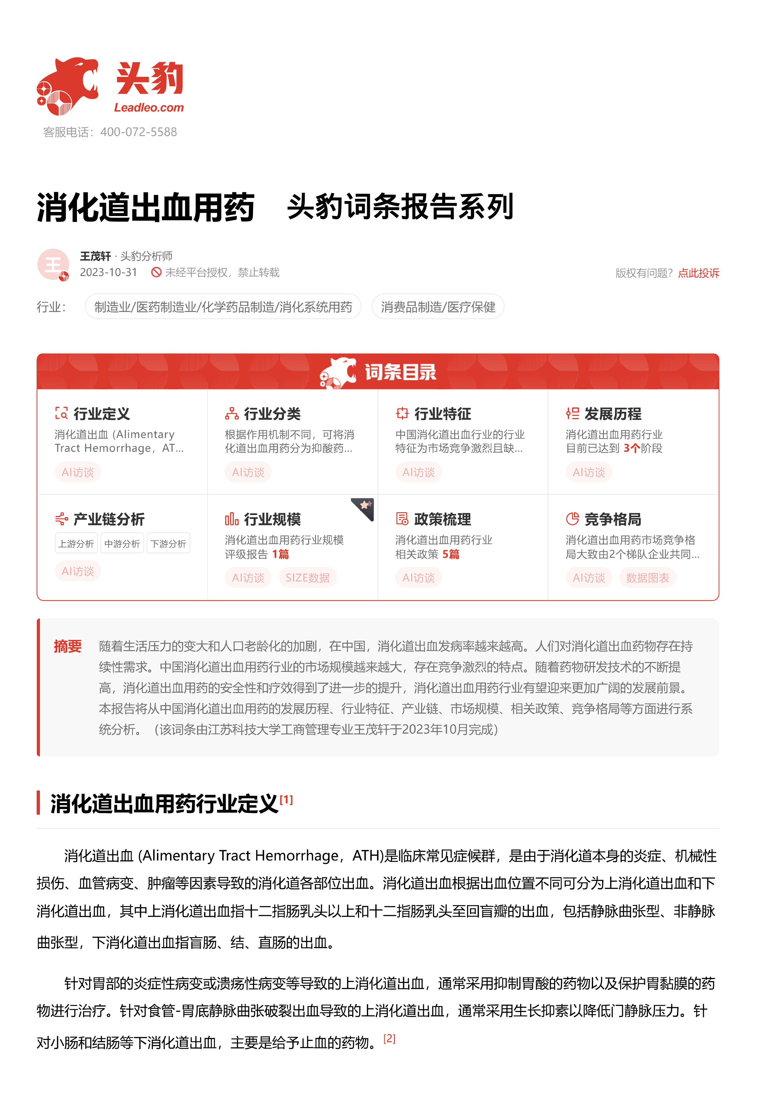 消化道出血用药 头豹词条报告系列