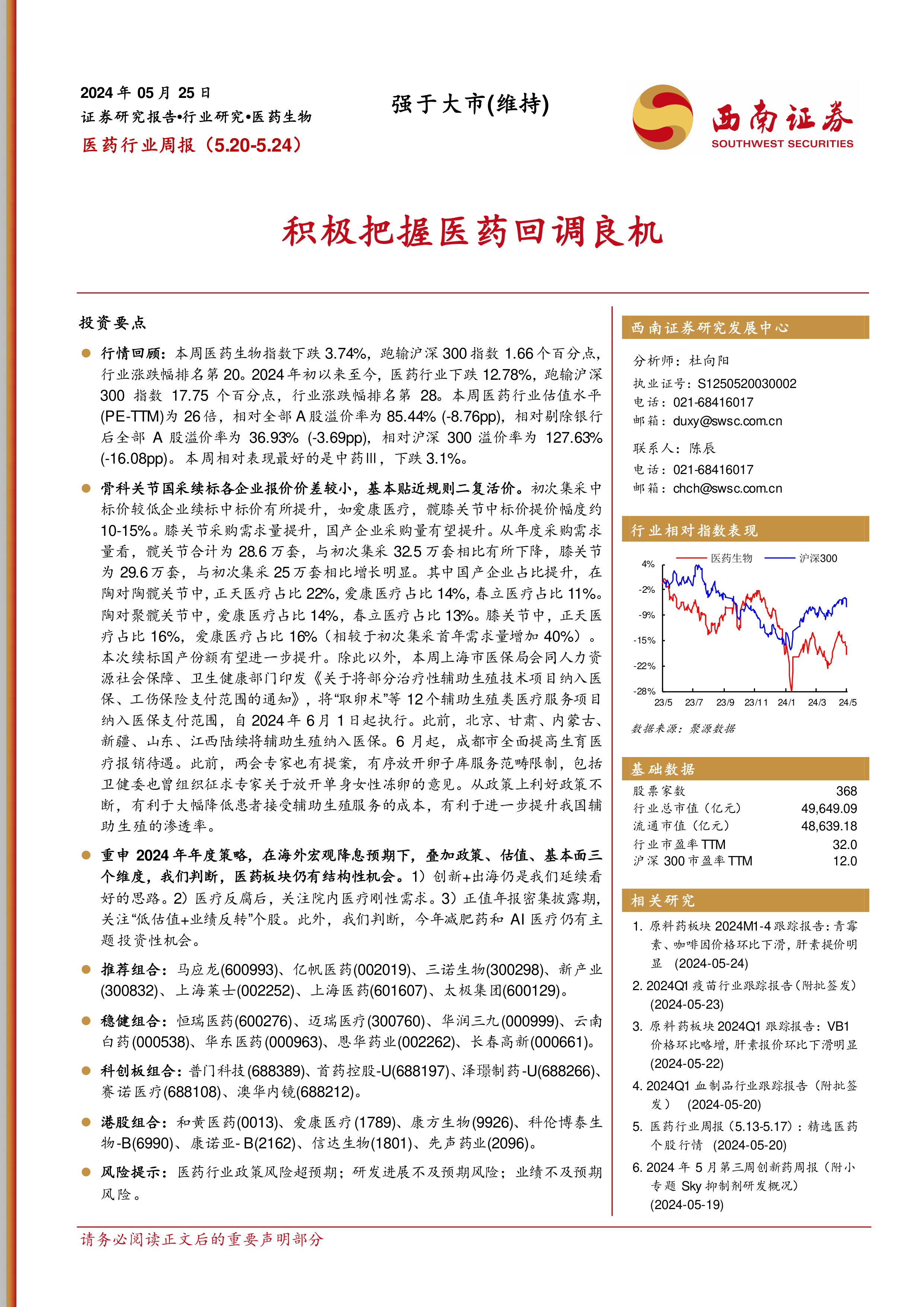 本报告基于对医药行业周报(5.20-5.24)数据的全面分析,得出医药板块仍存在结构性投资机会的结论。报告建议投资者关注创新+出海、院内医疗刚性需求以及低估值+业绩反转的个股,并密切关注政策变化和市场动态,谨慎投资。 报告中提供的组合表现分析、二级市场数据以及研究报告等信息,为投资者进行投资决策提供了重要的参考依据。 需要注意的是,报告中提到的投资建议仅供参考,投资者应根据自身情况进行独立判断,并承担相应的投资风险。