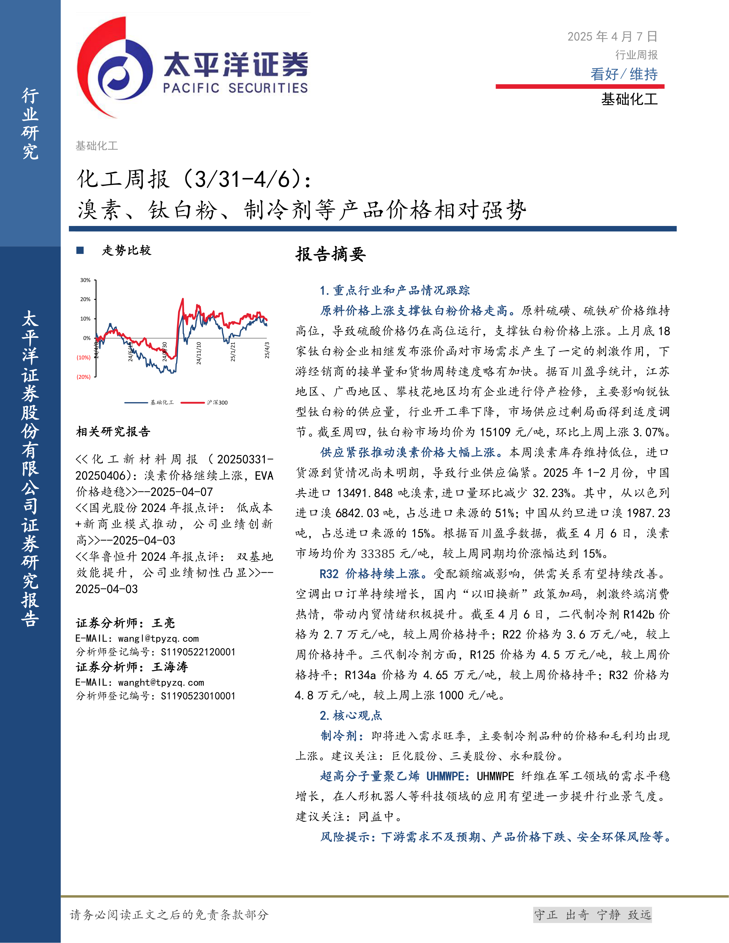 本报告的核心观点是:基础化工行业本周(3月31日-4月6日)呈现分化态势,部分产品价格强势上涨,部分产品价格下跌。溴素、钛白粉、制冷剂等产品价格相对强势,主要受供应紧张、成本上涨和需求旺季等因素驱动;而聚氨酯、部分农化产品、化学纤维等产品价格则持续回落,主要受下游需求低迷、库存高位等因素影响。