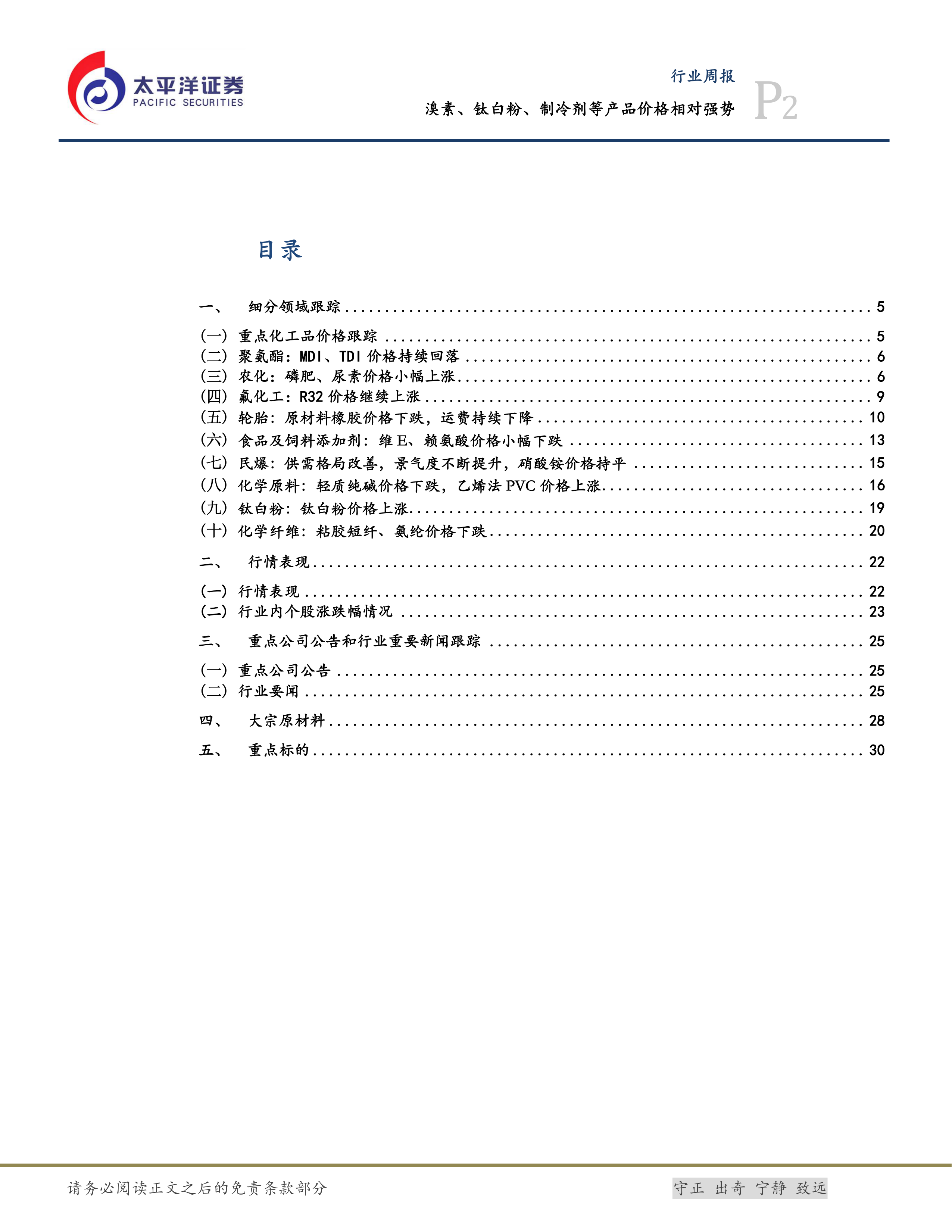 报告对重点化工品价格、聚氨酯、农化、氟化工、轮胎、食品及饲料添加剂、民爆、化学原料、钛白粉、化学纤维等十个细分领域进行了跟踪分析,分别从价格走势、成本变化、供需关系、行业库存、企业开工率等方面进行了详细的数据解读。例如,在重点化工品价格跟踪中,报告列出了58个产品的价格变化数据,并对涨跌幅居前的产品进行了重点分析;在聚氨酯领域,报告分析了MDI和TDI价格持续回落的原因;在农化领域,报告分析了草甘膦、磷肥和尿素的价格波动;在氟化工领域,报告分析了R32价格继续上涨的原因;在轮胎领域,报告分析了原材料橡胶价格下跌和运费持续下降对轮胎行业的影响;在食品及饲料添加剂领域,报告分析了维生素E、赖氨酸等产品价格小幅下跌的原因;在民爆领域,报告分析了供需格局改善对硝酸铵价格的影响;在化学原料领域,报告分析了轻质纯碱价格下跌和乙烯法PVC价格上涨的原因;在钛白粉领域,报告分析了钛白粉价格上涨的原因;在化学纤维领域,报告分析了粘胶短纤和氨纶价格下跌的原因。