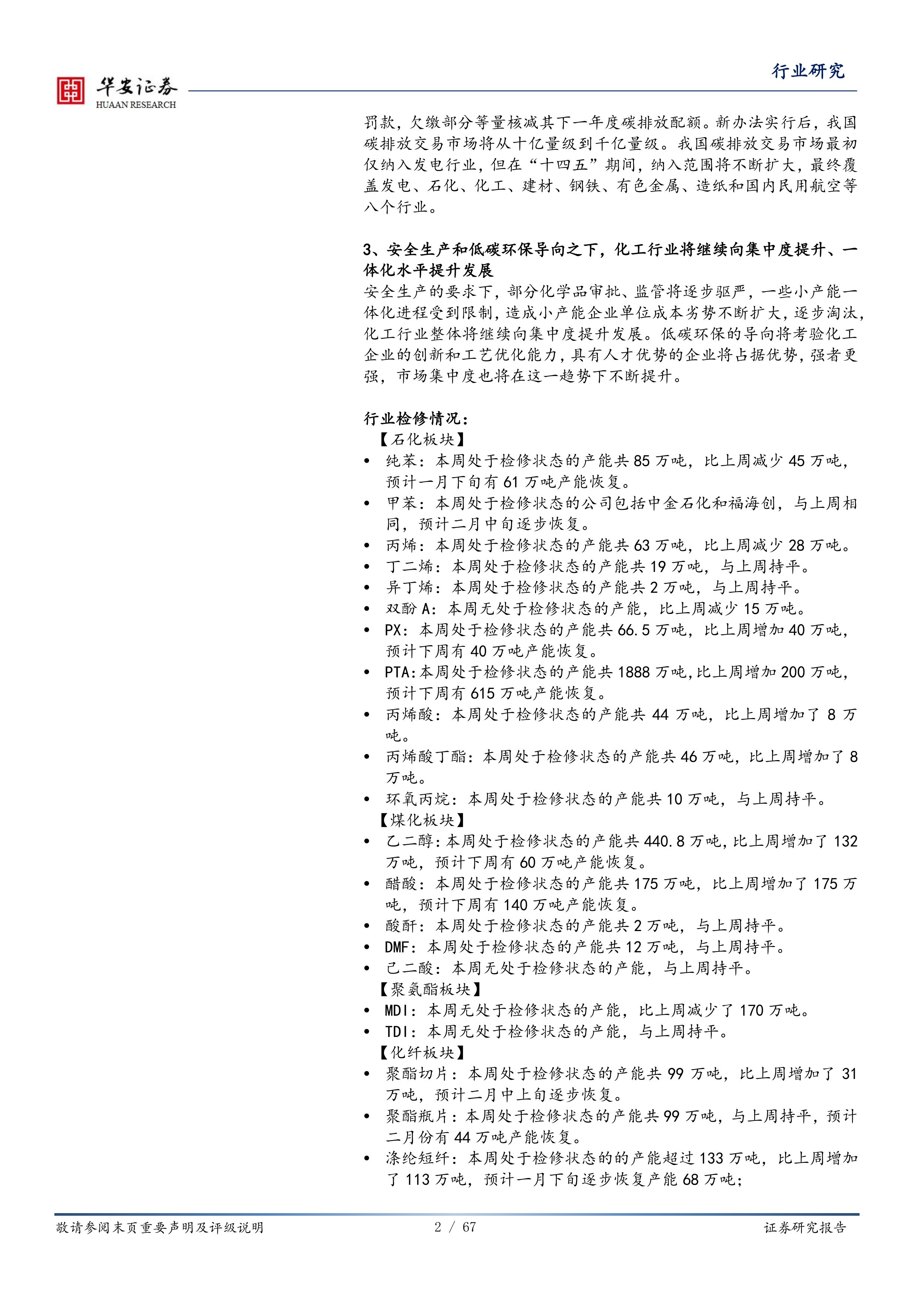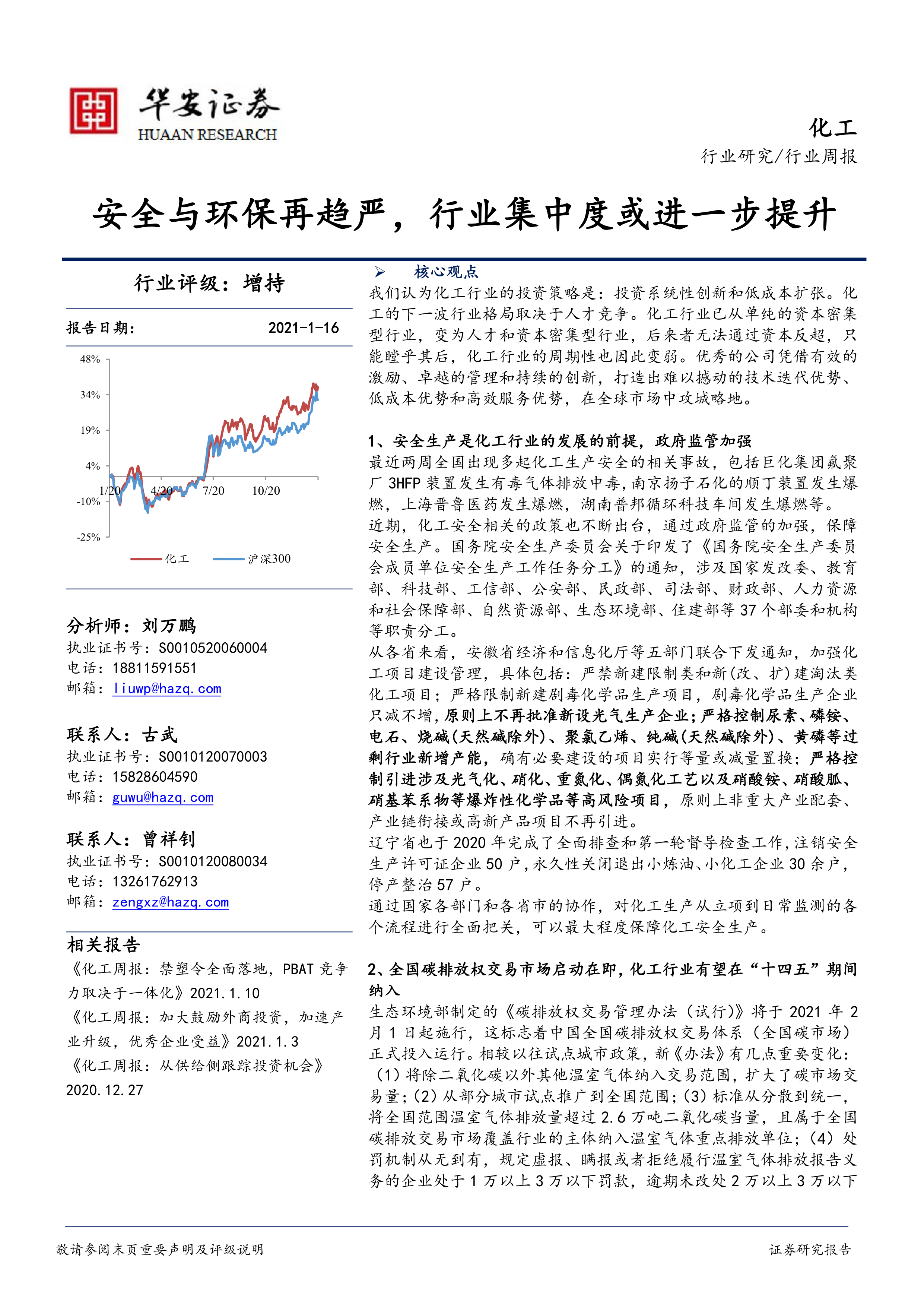 本报告的核心观点是:化工行业投资策略应聚焦于系统性创新和低成本扩张,未来行业格局将取决于人才竞争。 报告基于2021年1月16日的数据,分析了安全环保政策趋严、全国碳排放权交易市场启动以及行业集中度提升等因素对化工行业的影响,并对部分重点公司和新股进行了跟踪分析。