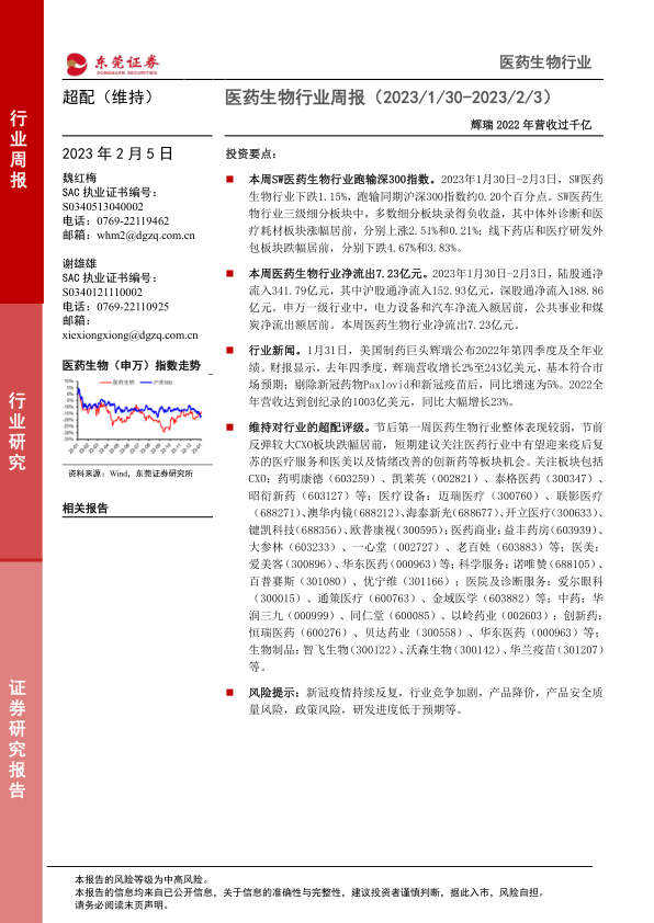 本报告的核心观点是:2023年1月30日至2月3日,SW医药生物行业表现弱于沪深300指数,多数细分板块录得负收益,但行业内约67%的个股录得正收益。陆股通资金净流出7.23亿元。辉瑞2022年营收突破千亿美元,但新冠相关业务贡献巨大。维持对医药生物行业的超配评级,建议关注疫后复苏的医疗服务、医美以及情绪改善的创新药板块。