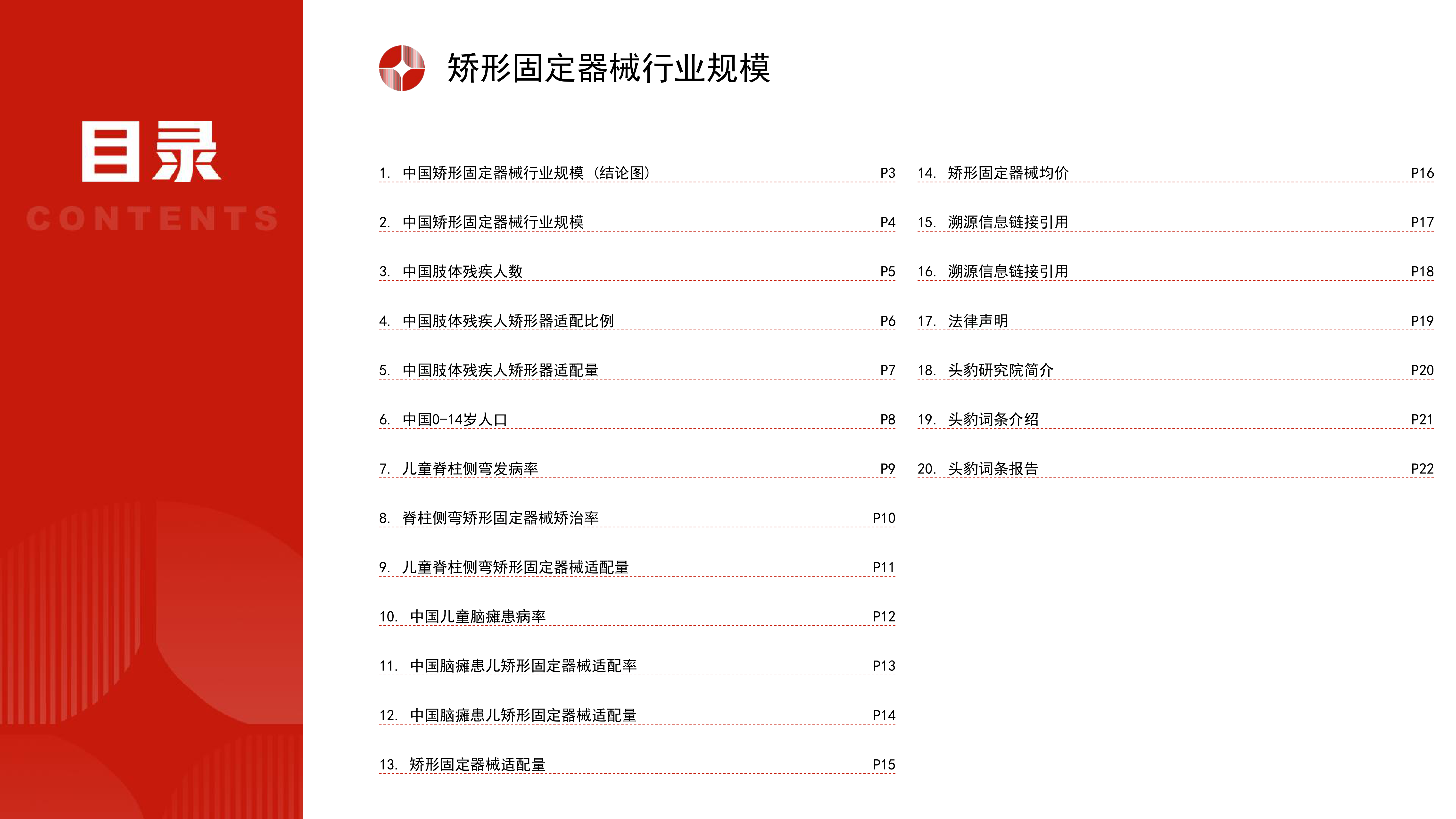 报告采用自上而下和自下而上的结合方法,通过对肢体残疾人矫形器适配量、儿童脊柱侧弯矫形器适配量以及儿童脑瘫矫形器适配量进行测算,并结合矫形固定器械均价,最终得出市场规模预测结果。关键驱动因素包括肢体残疾人口数量、矫形器适配比例、儿童脊柱侧弯和脑瘫患病率以及矫形器均价。