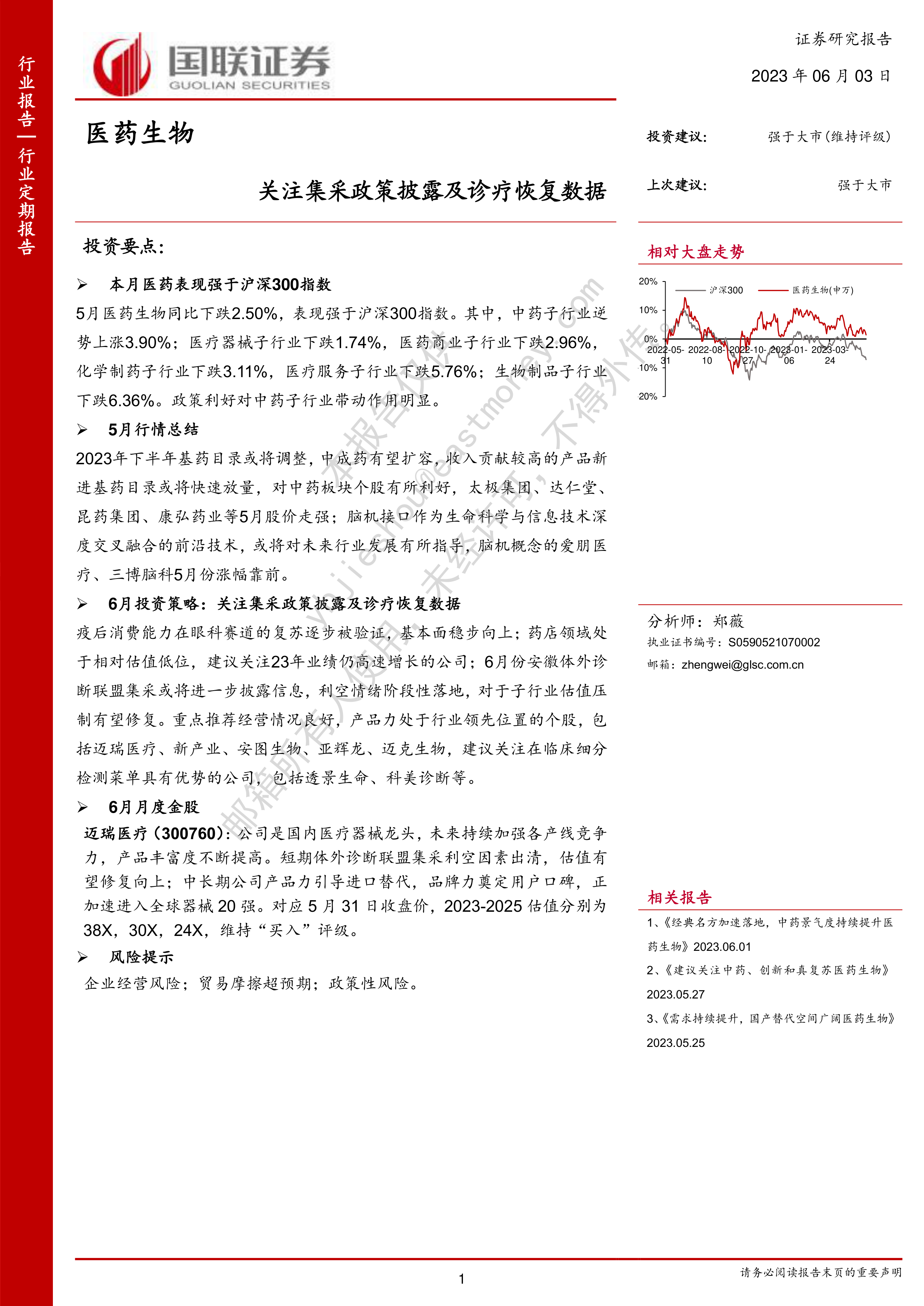 6月投资策略建议关注集采政策披露和诊疗恢复数据。重点推荐医疗器械、眼科和药店等领域业绩增长强劲的个股,并建议关注临床细分检测菜单具有优势的公司。