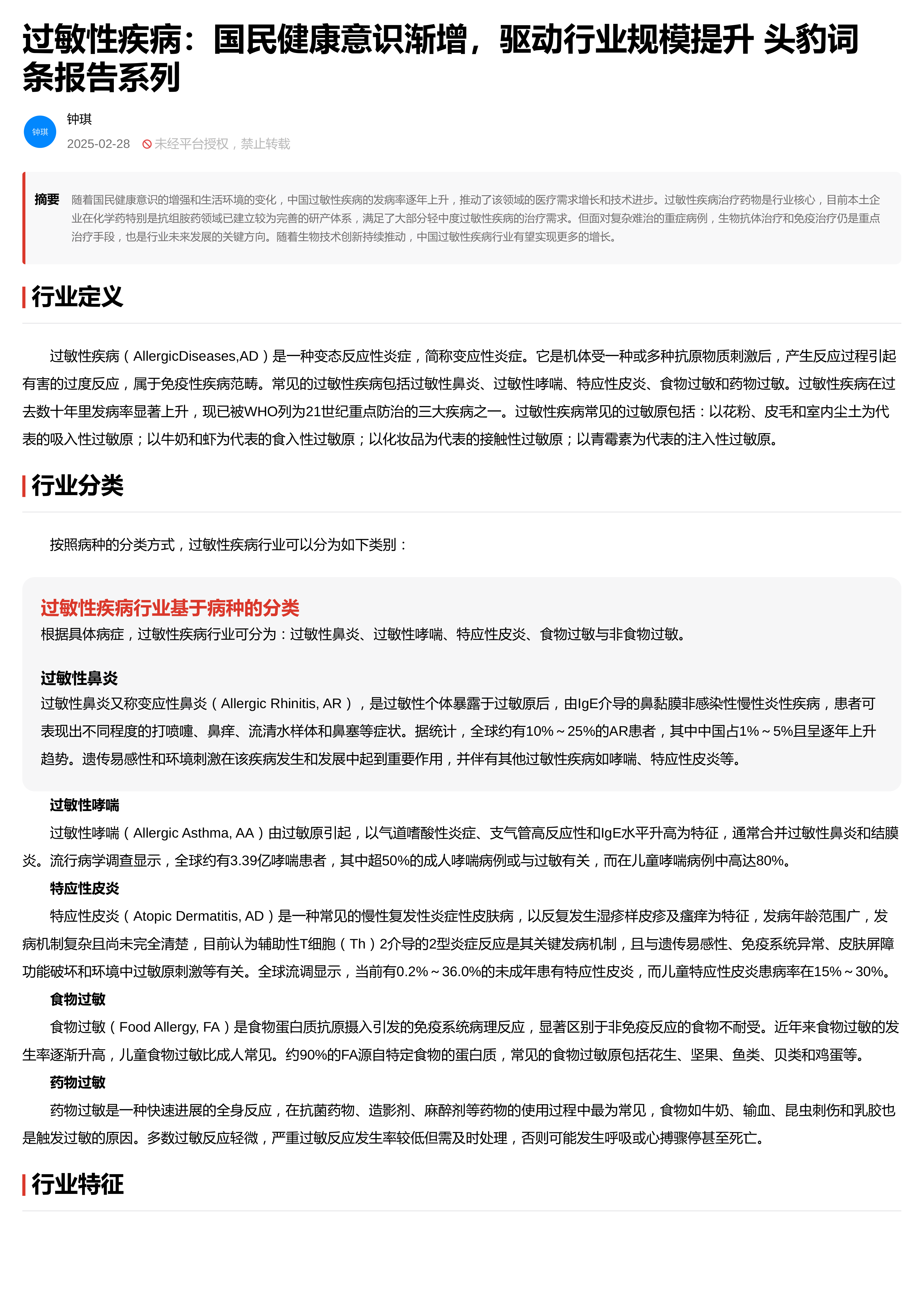 本报告基于头豹研究院发布的《过敏性疾病:国民健康意识渐增,驱动行业规模提升》报告,运用统计数据和市场分析,探讨中国过敏性疾病行业的市场规模、发展趋势、产业链结构以及竞争格局。核心观点如下: