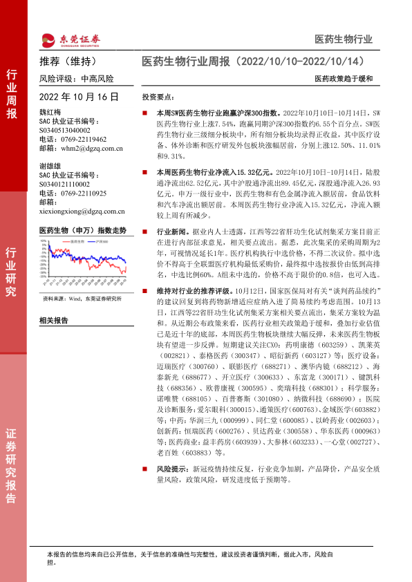 本报告通过对2022年10月10日至14日SW医药生物行业市场表现的全面分析,指出该行业在本周表现强劲,跑赢大盘,行业估值处于近十年低位,且近期医药政策趋于缓和。基于此,报告维持对医药生物行业的“推荐”评级,并建议投资者关注CXO、医疗设备等细分领域的龙头企业。 然而,投资者仍需关注疫情反复、政策变化、研发风险等潜在风险。 报告数据来源于Wind和东莞证券研究所,投资者需谨慎判断,风险自担。