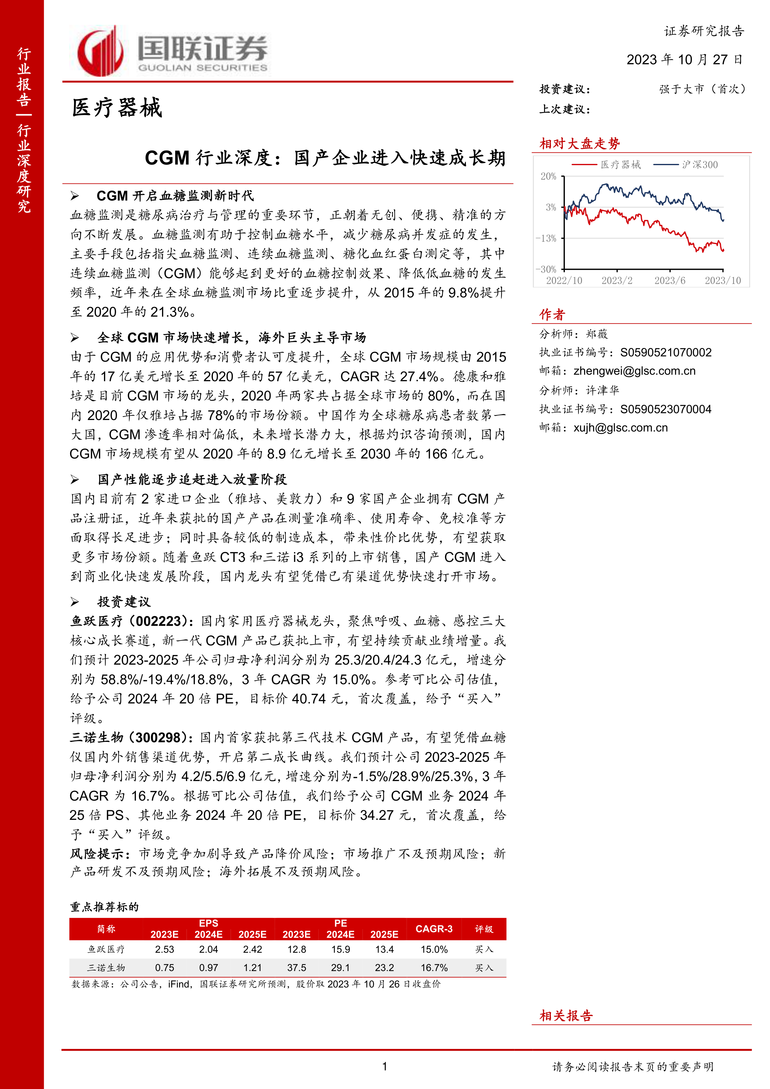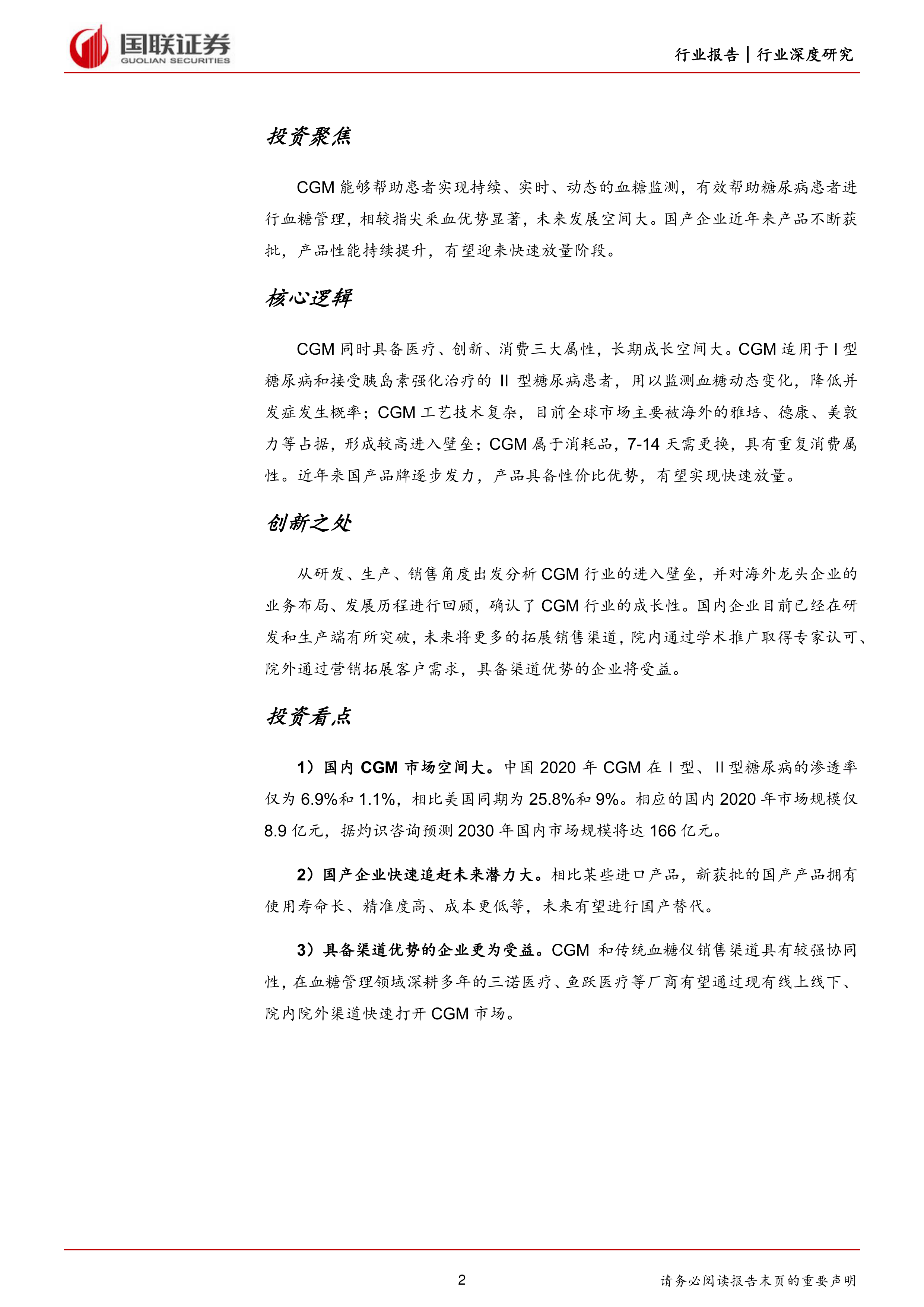 本报告的核心观点是:连续血糖监测(CGM)市场潜力巨大,国产企业正进入快速成长期,具备渠道优势的企业将显著受益。