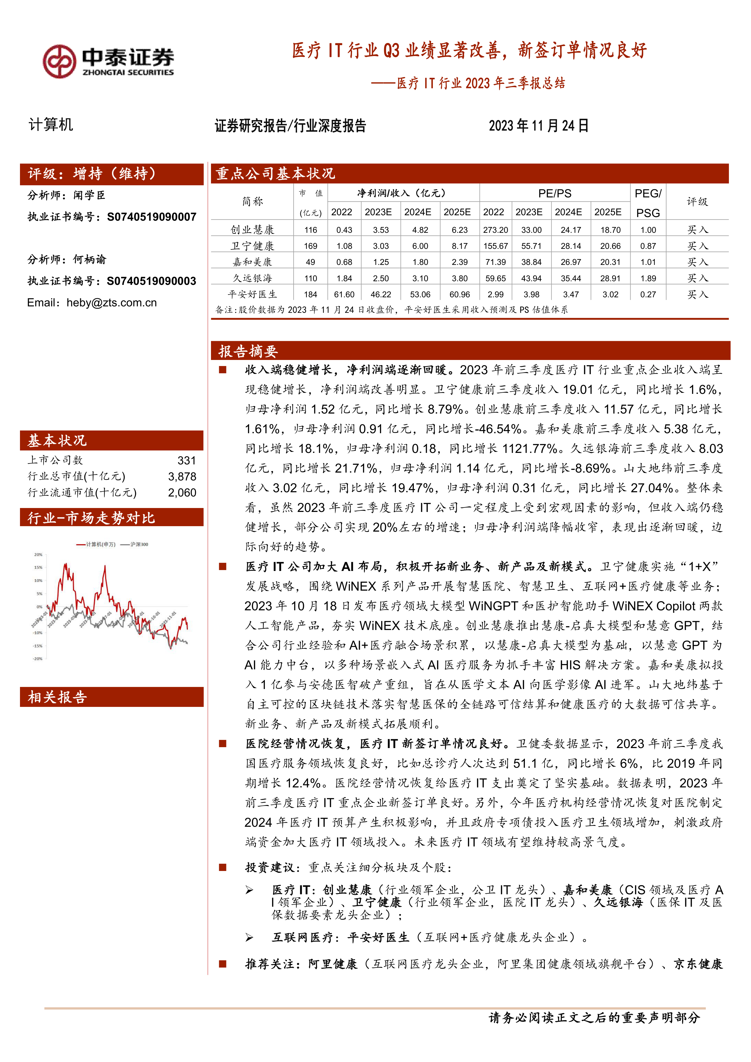 本报告的核心观点是:2023年三季度,中国医疗IT行业整体业绩显著改善,呈现出收入稳健增长、净利润逐渐回暖的积极态势。这一趋势主要受益于医院经营情况的恢复、医疗IT新签订单的增加以及政府对医疗卫生领域的持续投入。同时,医疗IT企业积极布局人工智能,开拓新业务、新产品和新模式,进一步增强了行业发展动力。报告建议重点关注细分板块及个股,并提示了潜在的投资风险。