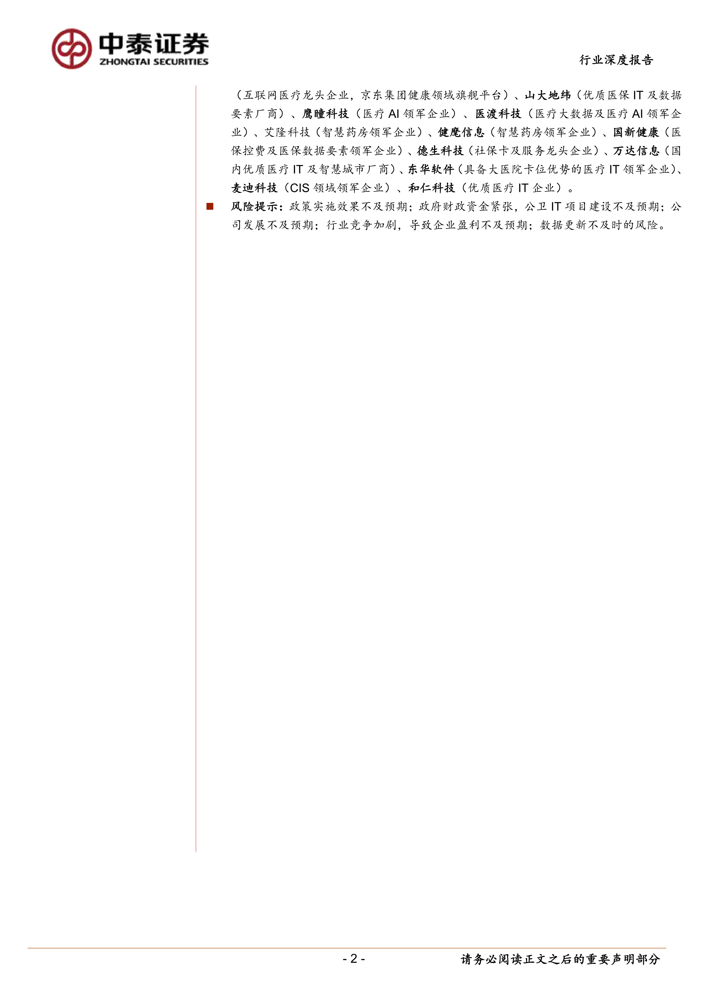 风险提示:政策实施效果不及预期;政府财政资金紧张,公卫IT项目建设不及预期;公司发展不及预期;行业竞争加剧,导致企业盈利不及预期;数据更新不及时的风险。