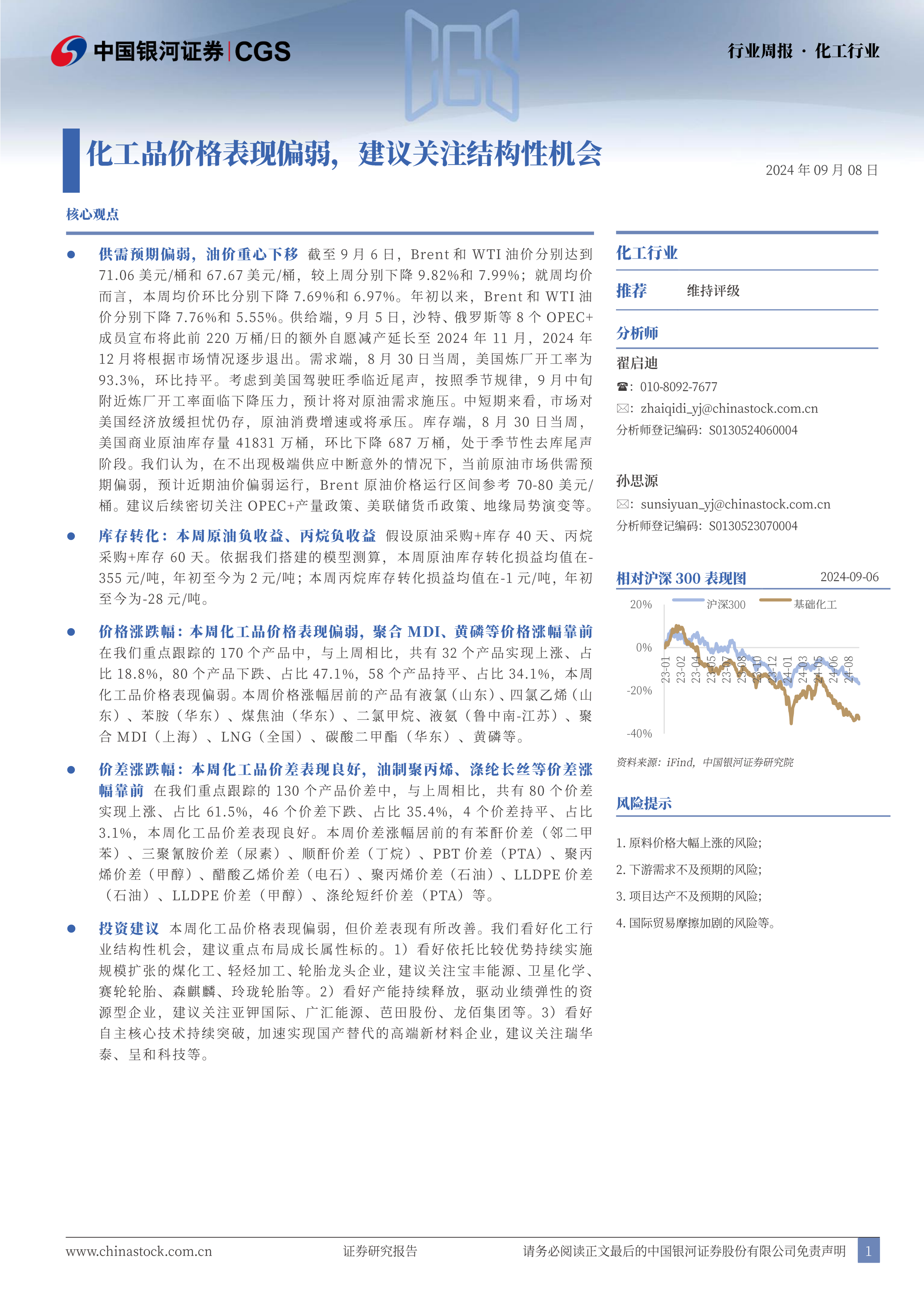 化工行业行业周报:化工品价格表现偏弱,建议关注结构性机会