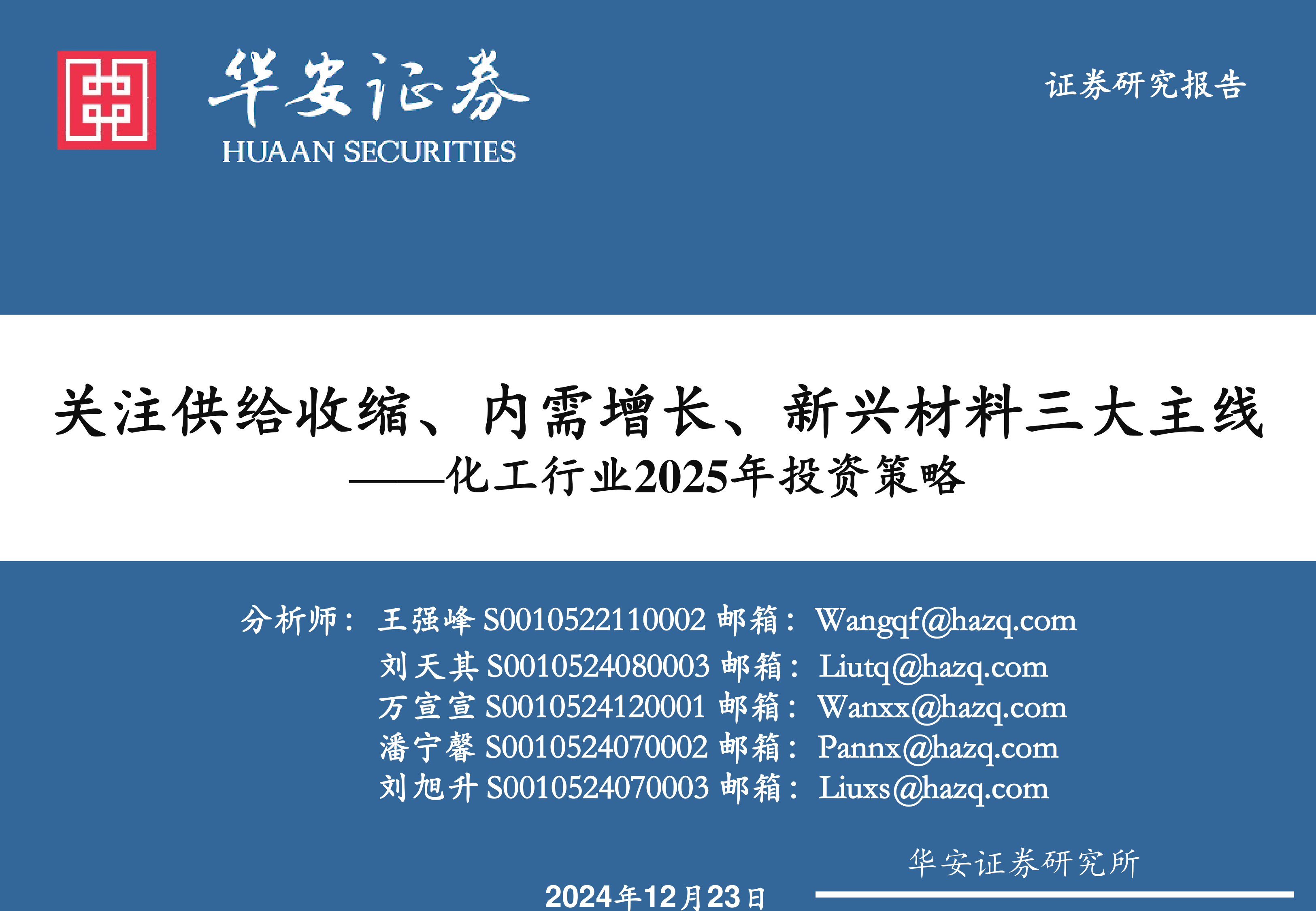 化工行业2025年投资策略:关注供给收缩、内需增长、新兴材料三大主线