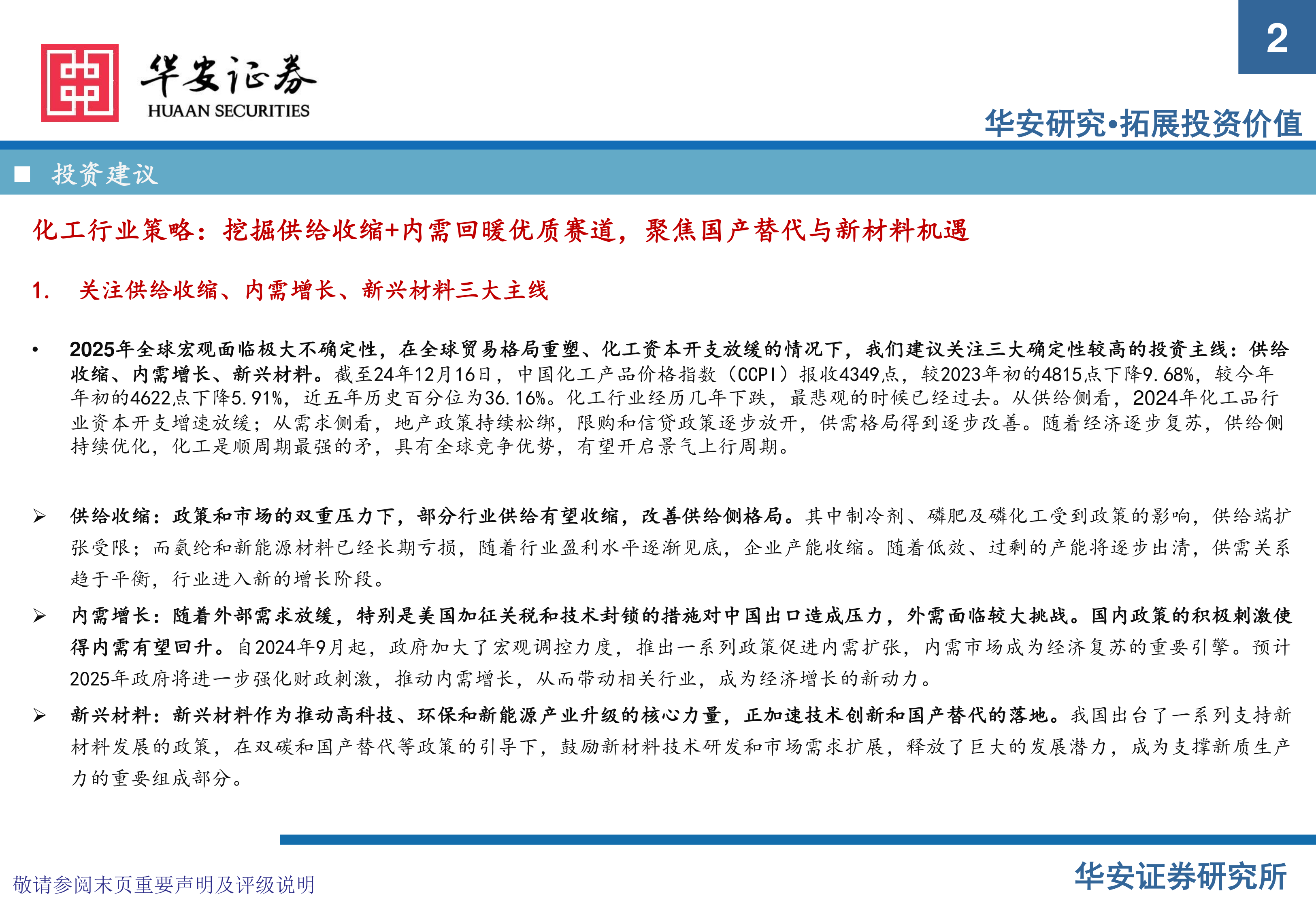本报告对中国化工行业2025年的投资策略进行了深入分析,认为在全球宏观经济面临不确定性的背景下,中国化工行业有望迎来景气上行周期。报告基于对宏观经济、行业供需、政策环境和公司业绩的综合分析,提出了关注供给收缩、内需增长和新兴材料三大投资主线,并推荐了一系列具有投资价值的化工企业。投资者应根据自身风险承受能力和投资目标,谨慎参考报告内容进行投资决策。 报告也明确指出了潜在的投资风险,提醒投资者注意风险管理。