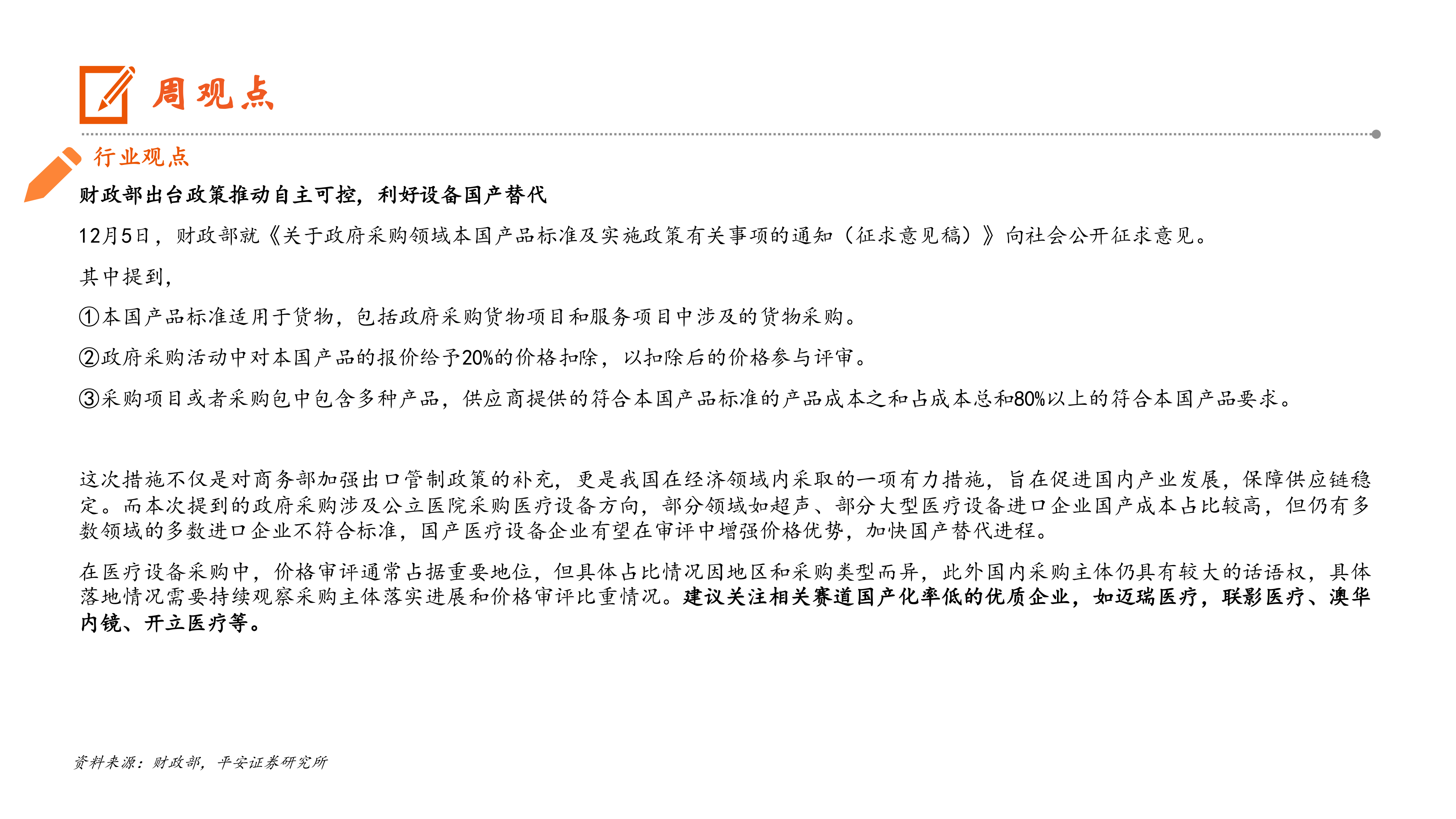 财政部发布的《关于政府采购领域本国产品标准及实施政策有关事项的通知(征求意见稿)》中,对本国产品报价给予20%的价格扣除,并规定采购项目中本国产品成本占比达到80%以上即可符合要求。此举将显著增强国产医疗设备在政府采购中的价格竞争力,加速国产替代进程,尤其利好国产化率低的优质企业,如迈瑞医疗、联影医疗、澳华内镜、开立医疗等。 虽然具体落地情况仍需持续观察,但该政策无疑为国产医疗设备行业发展注入强心剂。