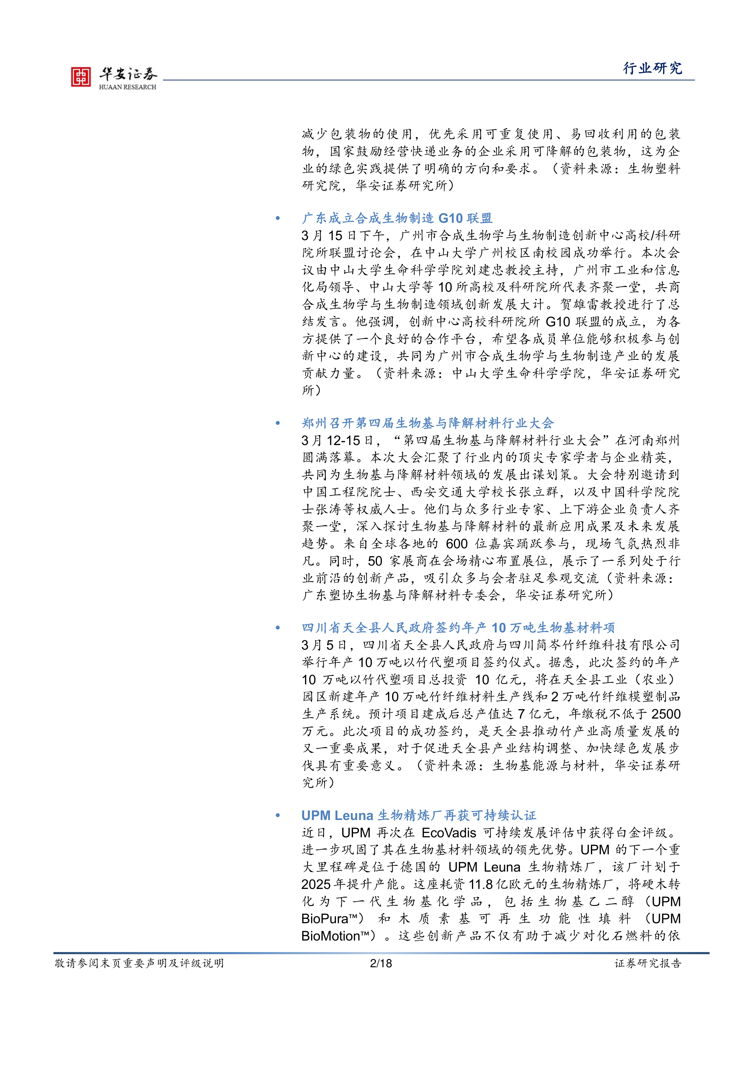 3月12日,国务院总理李强主持召开国务院常务会议,审议通过《国务院关于修改〈快递暂行条例〉的决定(草案)》。会议指出,针对快递包装问题对《条例》进行专项修改,有利于推动快递包装绿色化、减量化、可循环,加快形成绿色生产和生活方式。要坚持系统治理、协同治理,夯实快递企业主体责任,对上游生产企业、商家和下游消费者加强引导规范,推进全链条治理。要完善快递包装绿色转型的综合性支持政策,有效降低包装、回收、清洗、调拨等运营成本,充分调动各方面积极性,营造绿色发展的良好社会氛围。条例要求经营快递业务的企业应当在保障快件安全的前提下,优化快件包装方式和包装结构设计,减少包装物的使用,优先采用可重复使用、易回收利用的包装物,国家鼓励经营快递业务的企业采用可降解的包装物,这为企业的绿色实践提供了明确的方向和要求。(资料来源:生物塑料研究院,华安证券研究所)