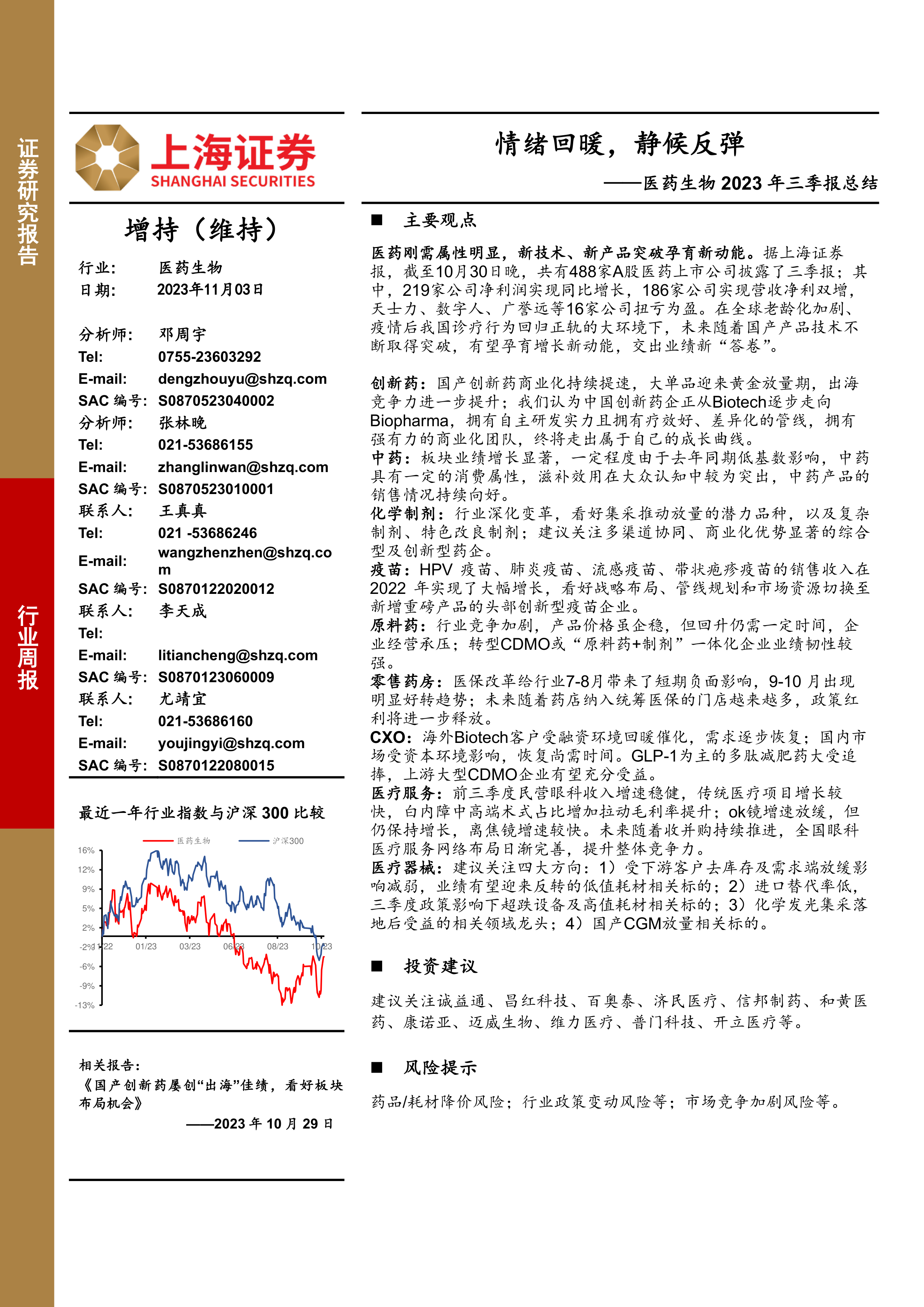 医药生物2023年三季报总结:情绪回暖,静候反弹