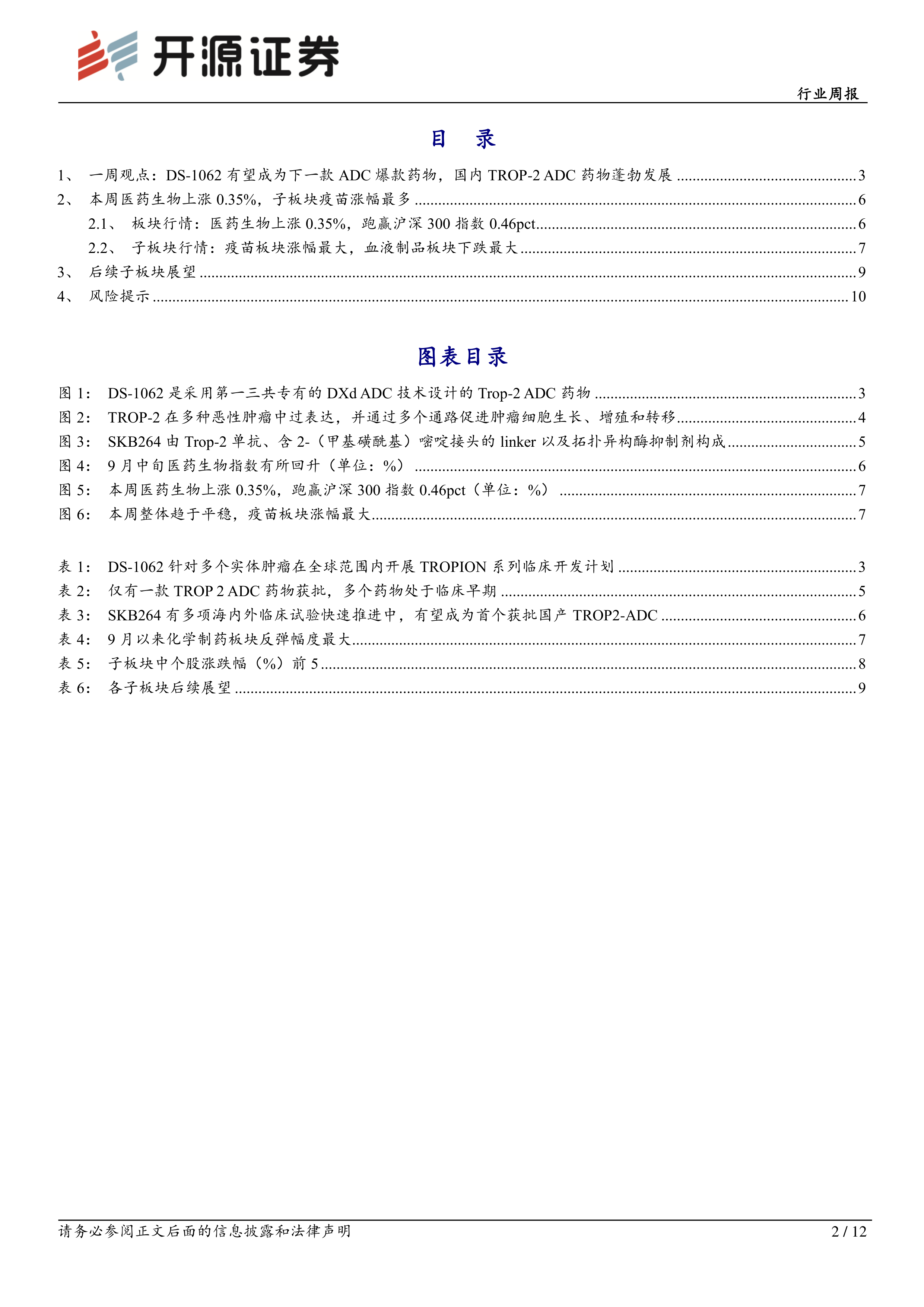 本报告的核心观点是:DS-1062作为一款新型TROP-2 ADC药物,临床数据积极,有望成为下一代ADC爆款药物,推动国内TROP-2 ADC药物市场蓬勃发展。同时,国内外TROP-2 ADC药物研发竞争激烈,科伦药业的SKB264处于领先地位,但其他公司也在积极推进研发。本周医药生物板块整体表现平稳,疫苗板块涨幅最大,而血液制品板块跌幅最大。