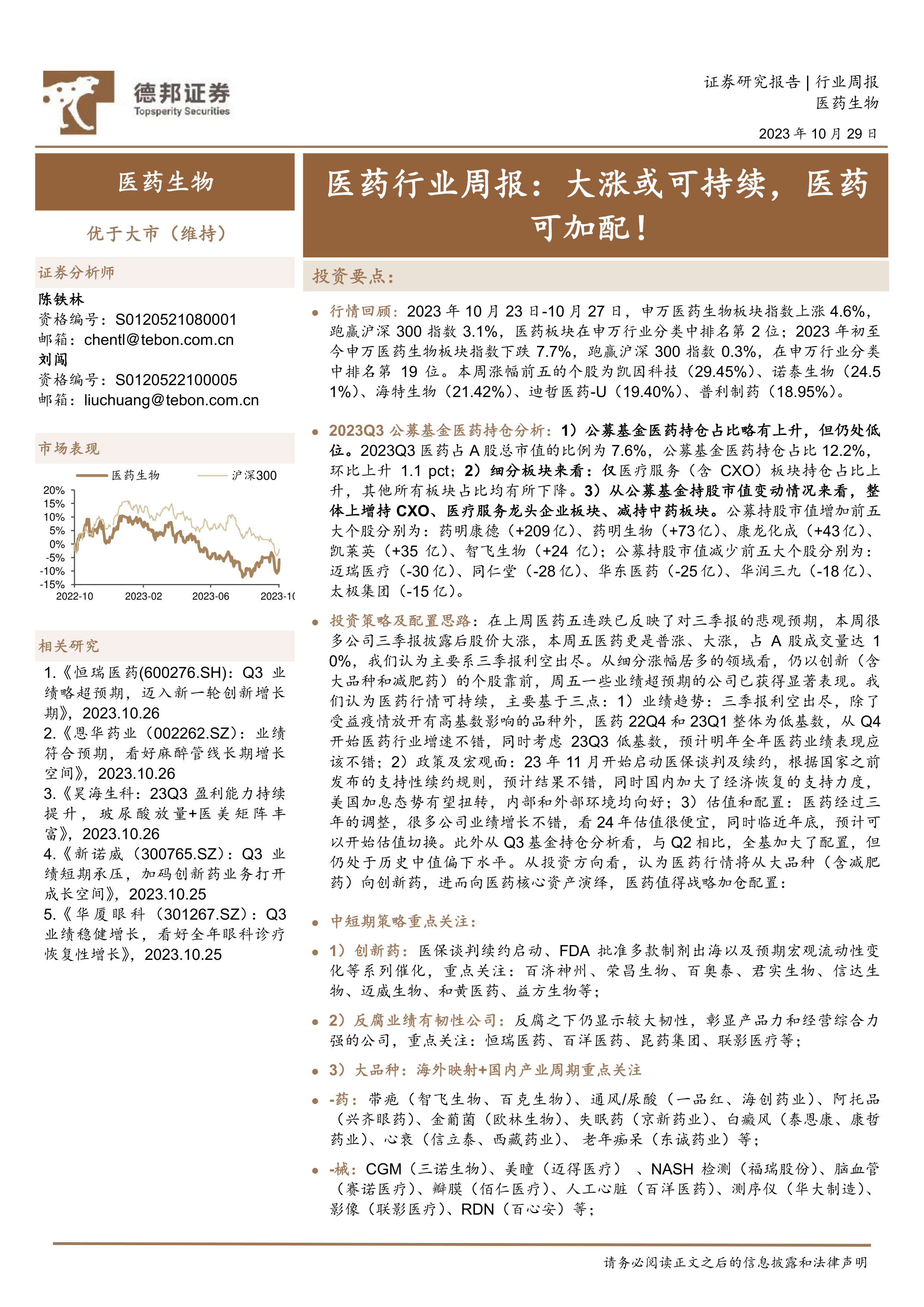 行情回顾:2023年10月23日-10月27日,申万医药生物板块指数上涨4.6%,跑赢沪深300指数3.1%,医药板块在申万行业分类中排名第2位;2023年初至今申万医药生物板块指数下跌7.7%,跑赢沪深300指数0.3%,在申万行业分类中排名第19位。本周涨幅前五的个股为凯因科技(29.45%)、诺泰生物(24.51%)、海特生物(21.42%)、迪哲医药-U(19.40%)、普利制药(18.95%)。